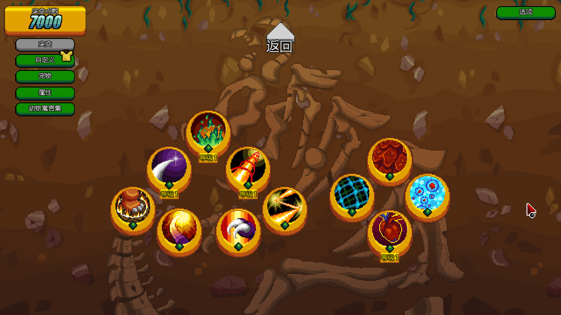 获得的金币可以用来强化它,比如提升属性甚至是进行突变。每个怪物都拥有各种各样的技能和属性提升。我们每升5级可以解锁一个新技能,一共五个技能,并且每个技能可以提升到最高十级。每个怪物的技能都有自己的特点,可以自己选择自己喜欢的玩法。