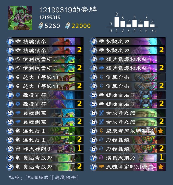 今天用这套打了14把,输了两把。带了新卡侧翼合击和英雄牌,为了配合英雄牌带了邪火神射手+演员大接力这个 combo还有灵魂学家马力西亚,换下了原本的邪能弹幕+杰斯这一邪能法术体系。侧翼合击和英雄牌使得对抗剽窃贼和任务战等节奏或快攻时节奏更好,同时英雄牌提高了卡组伤害上限。