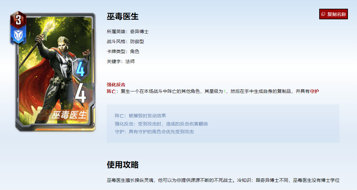 大宗师左边的4星工具人阵亡后,召唤4星巫毒医生。4星医生阵亡后,不仅原地复活一名4星随从,手中还塞入一张4星守护巫毒医生。