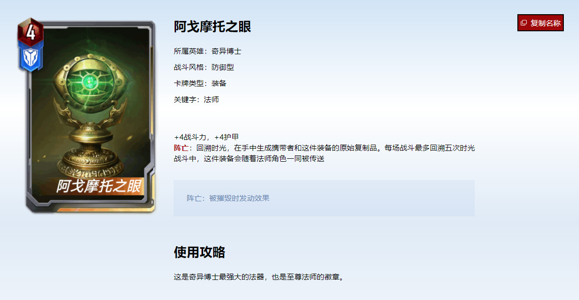 阿戈摩托之眼是可以随着支援法师入场的,你会惊奇的发现黄队带着绿队的装备。并且,对于古一来说,如果带着时间宝石一头创死,直接就可以把刚刚复活的自己给拉到场上,确实有时间宝石的味道了。