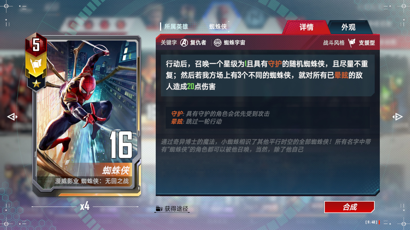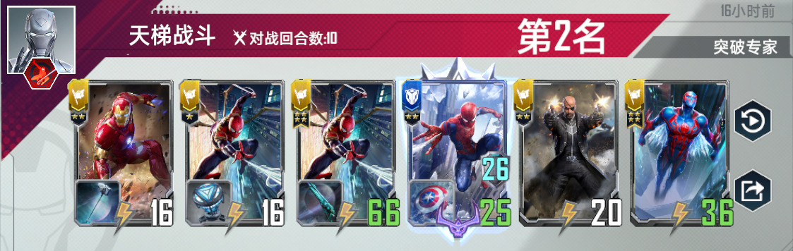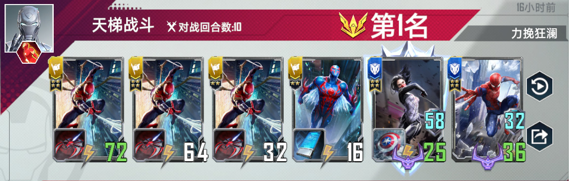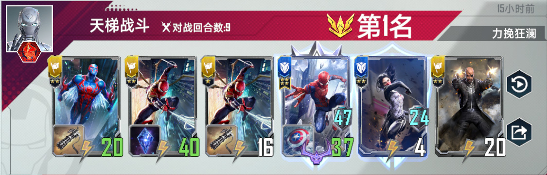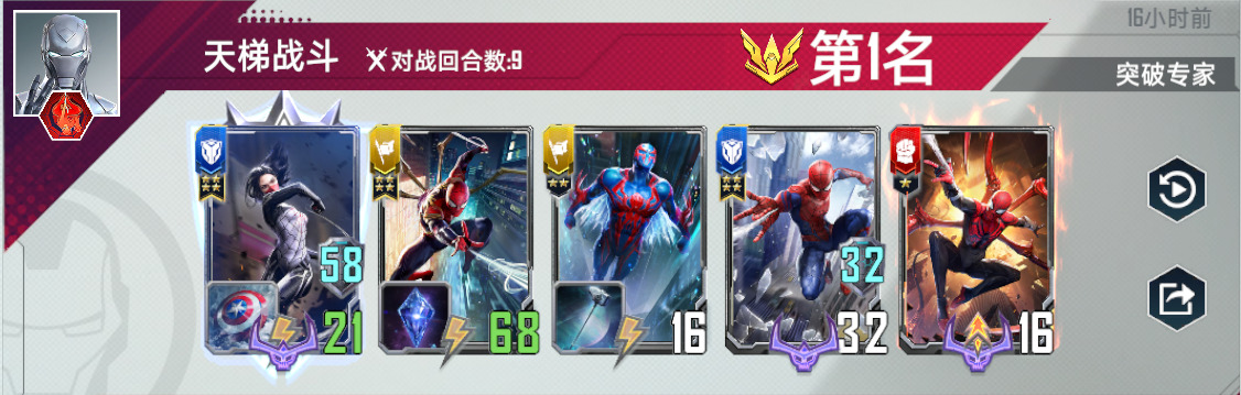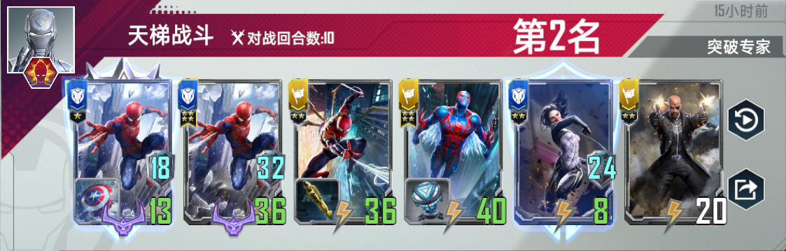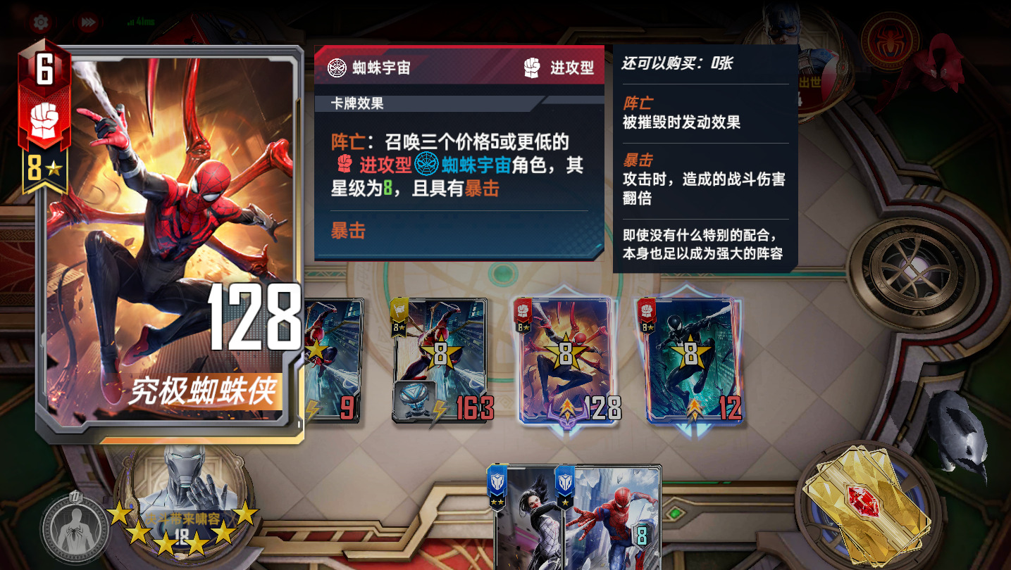 蜘蛛侠2099,满编四张,有了他,任何蜘蛛单位都是四星蛛丝。上五之后,第一张2099是必拿的,如果血量危急,不要拿第二张2099,先全力找到荷兰弟。