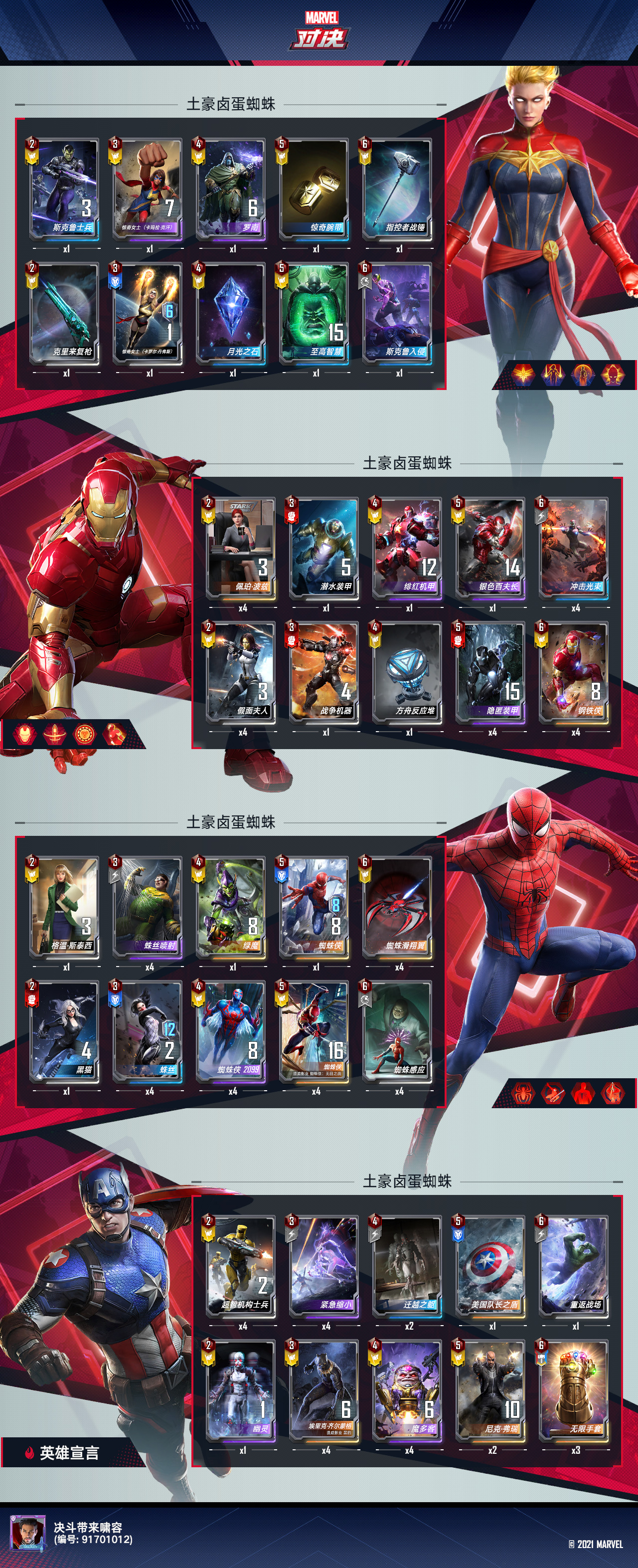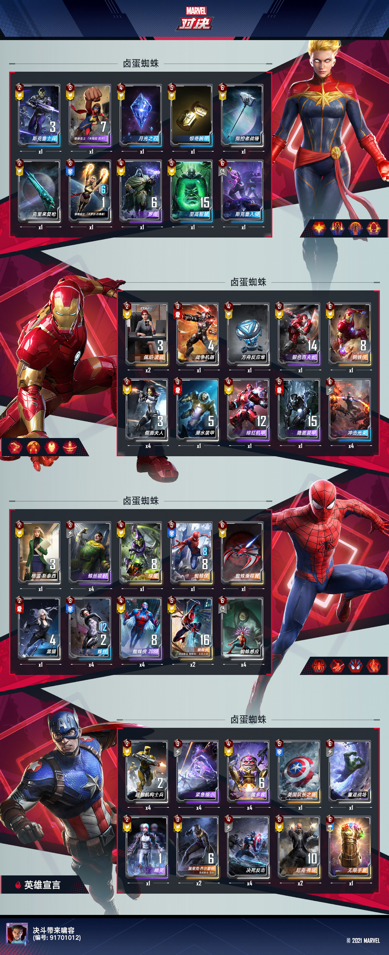 大家好,我是望舒,致力于微氪卡组探讨,让每位玩家都能从游戏中找到自己的乐趣。许久不见,近期三次元事务繁忙,之前开发了一套血牛万能,苦于没有时间,未能写出来。昨天新卡蜘蛛侠上线,为区分新蜘蛛侠和蓝蜘蛛侠,简称荷兰弟。大家的热情高涨,在天梯中可以看到各式各样的荷兰弟卡组,我自然也加入其中,一下午下来,胜率在50左右。直到经过攻略组同仁张某人的指点,带上卤蛋,胜率飙升,昨晚战绩51111112121241,这个战绩我非常满意,遂决定把这套强势卡组分享出来。