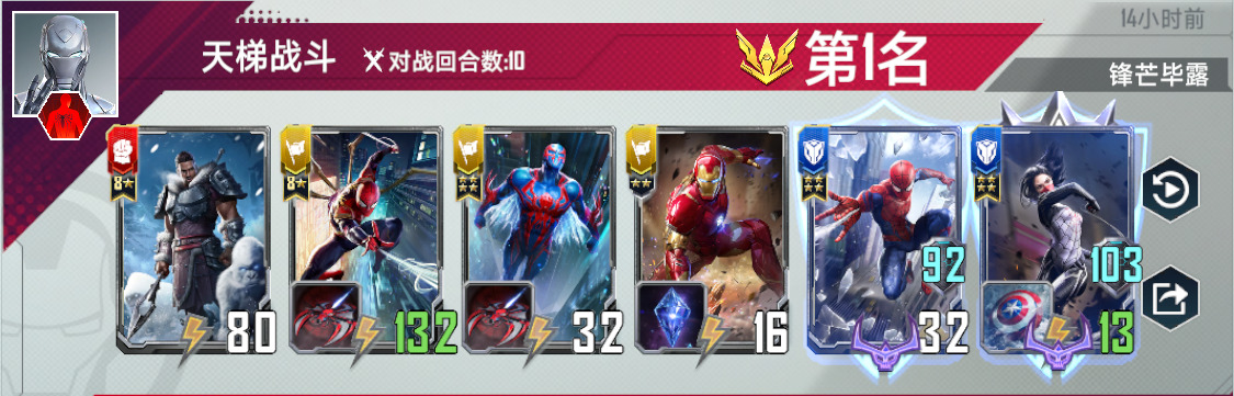 这一把对手有携带蜘蛛侠,为了防备对手的蛛丝喷射,故将蛛丝放在一号位,毕竟守护者战锤被缴械有点心疼,把蛛丝拿到前面吃缴械。友好邻居这个技能非常强力,经常给各类蜘蛛侠。
