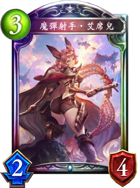 为了在不亏节奏的情况下解决过牌不足的问题,这套牌投入了魔弹射手·艾席儿。她能提供过牌,也能从刷进化中获益,在中后期作为3费4/4疾驰参与分段斩杀。如果对局拖到后期,艾席儿还有机会触发解放奥义,作为额外的制胜手段发挥价值。