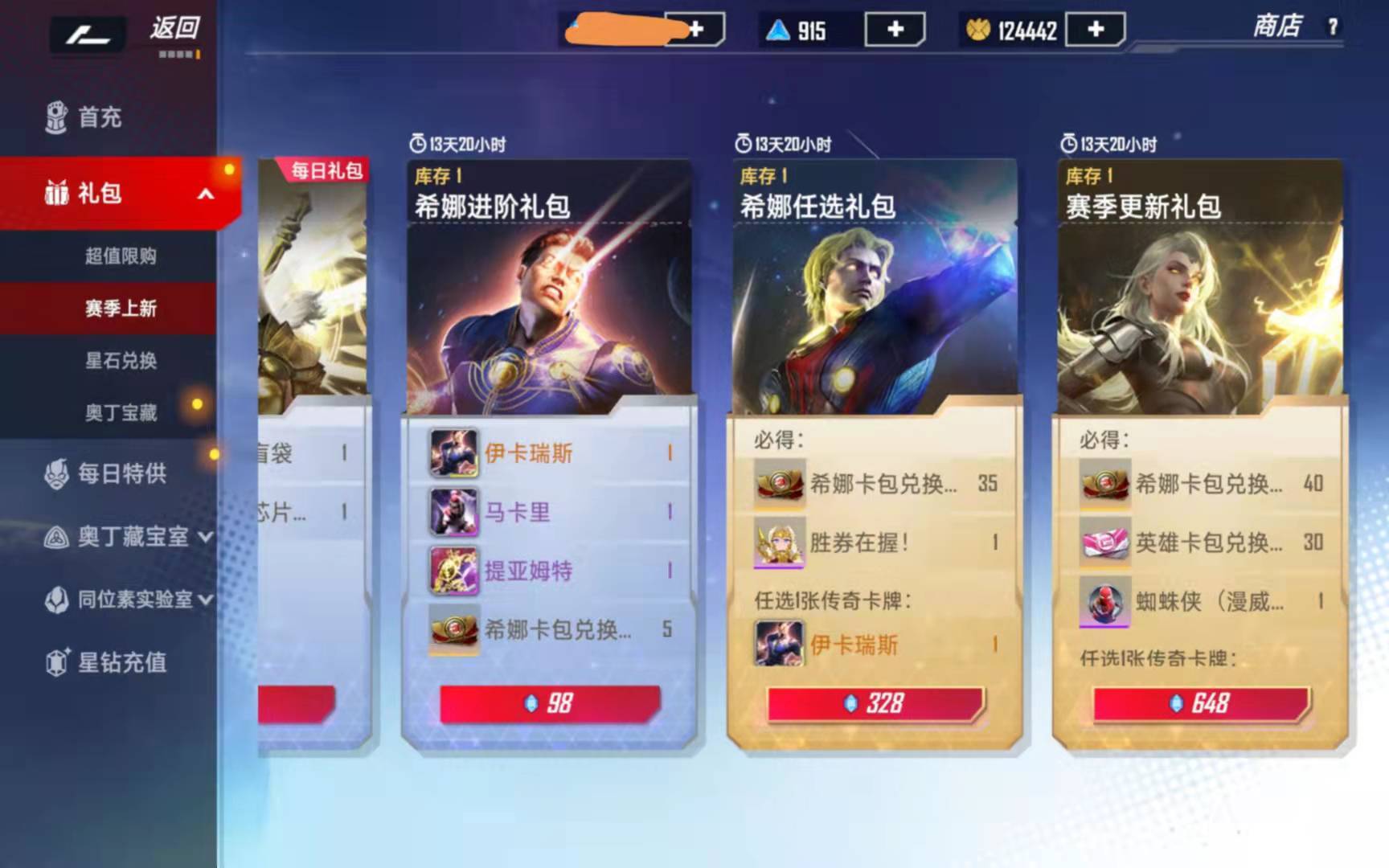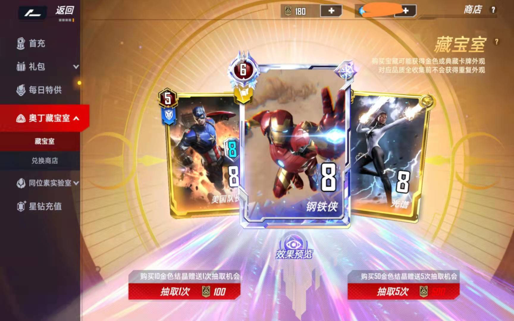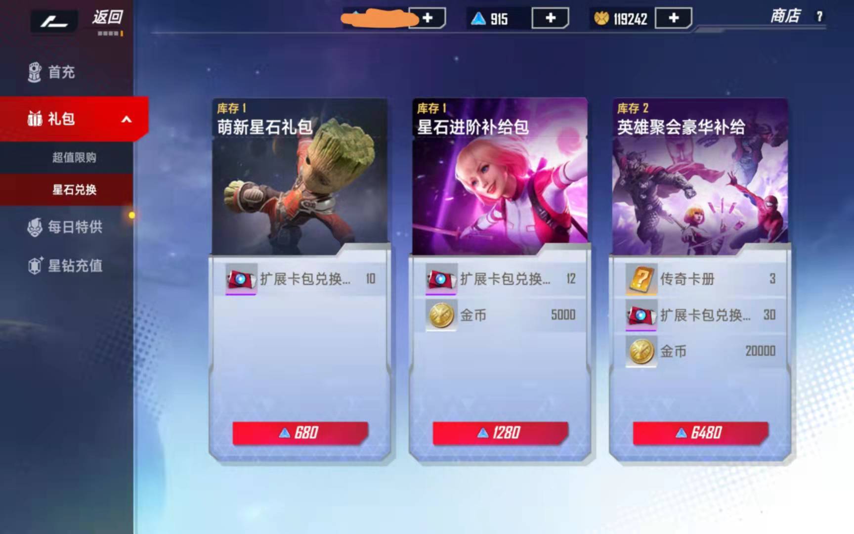 这个礼包需要打到黄金五级才会解锁,15个粉包,还会白送一张核心橙卡:蜘蛛侠、索尔、星爵三选一,建议选索尔。