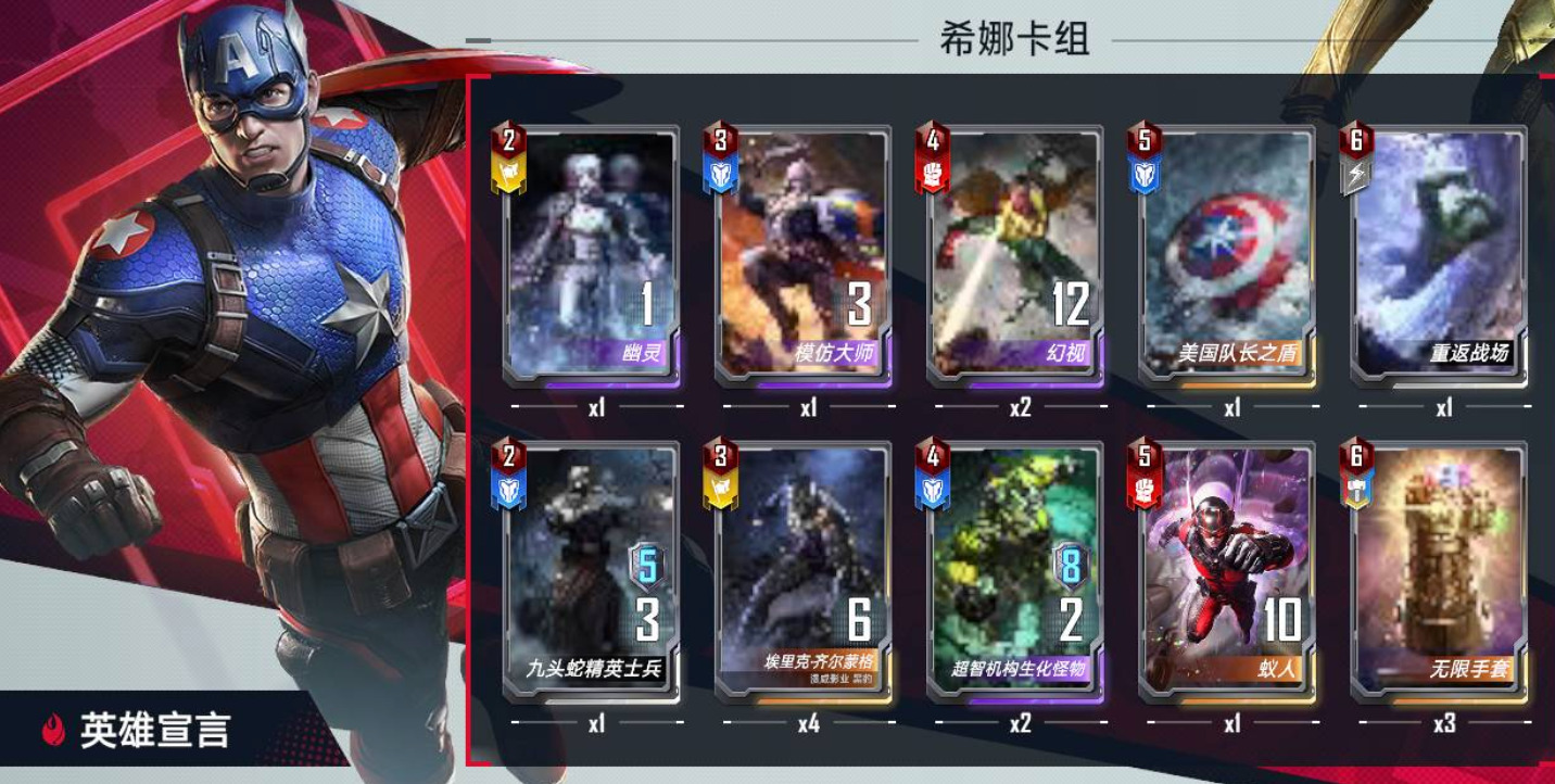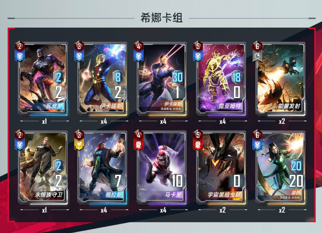 另外蚁人能量剑则作为队伍里的另一个核心存在,毕竟这套配合在上个赛季鞭狂套牌也是经典配搭了,也是对局的关键制胜点所在。另外看对手再补充一些幻视等工具人即可。这里就先简单叙述一下,具体打法及运营思路下面再聊。