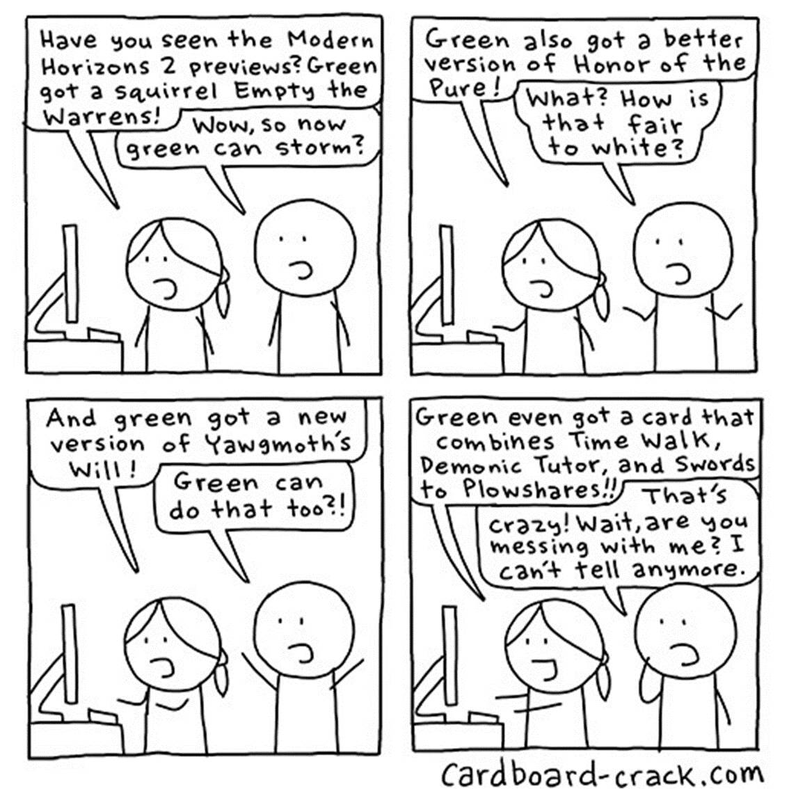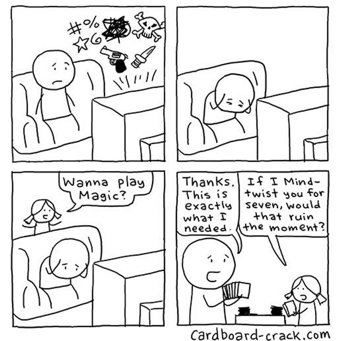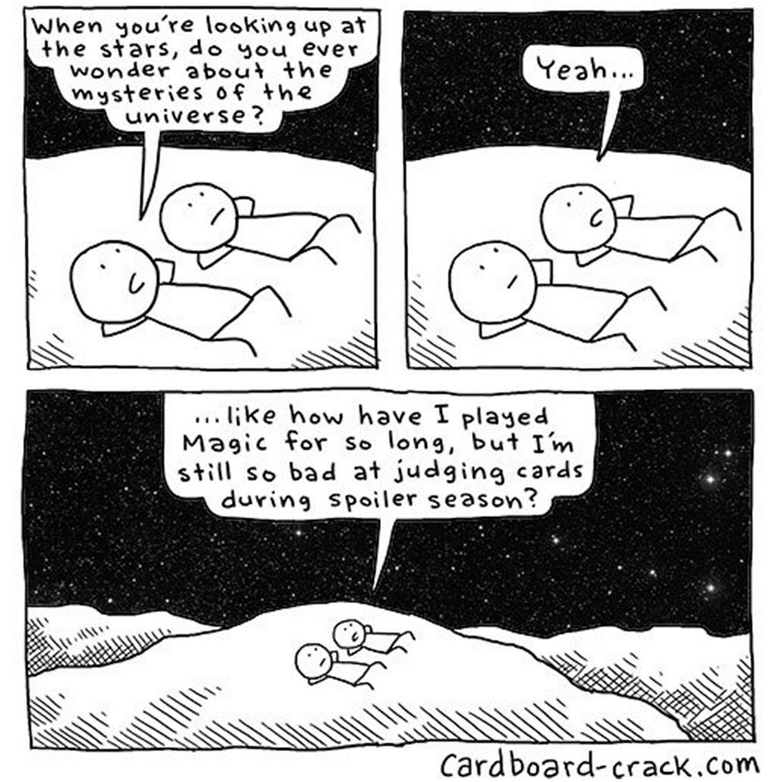 初入营地让我觉得新鲜热闹,万智版块最爱的就是能看图用着方便的卡查小漫画和各路幽默的评论。看了一段时间发现营地的搬运和翻译断更了,于是就这样接过了小漫画的翻译,很幸运得到了原译者、营地编辑和大家的支持。上面的5幅年度小漫画里有两幅没有标题,正是之前的译者译的。只可惜一年过去,游戏内外,事事在变。我拿着和@58653的私信记录,怎么也想不起他的原昵称了,FelixN?头像是一只狐狸。感谢他的付出和鼓励,也感谢大家的支持和喜爱。
