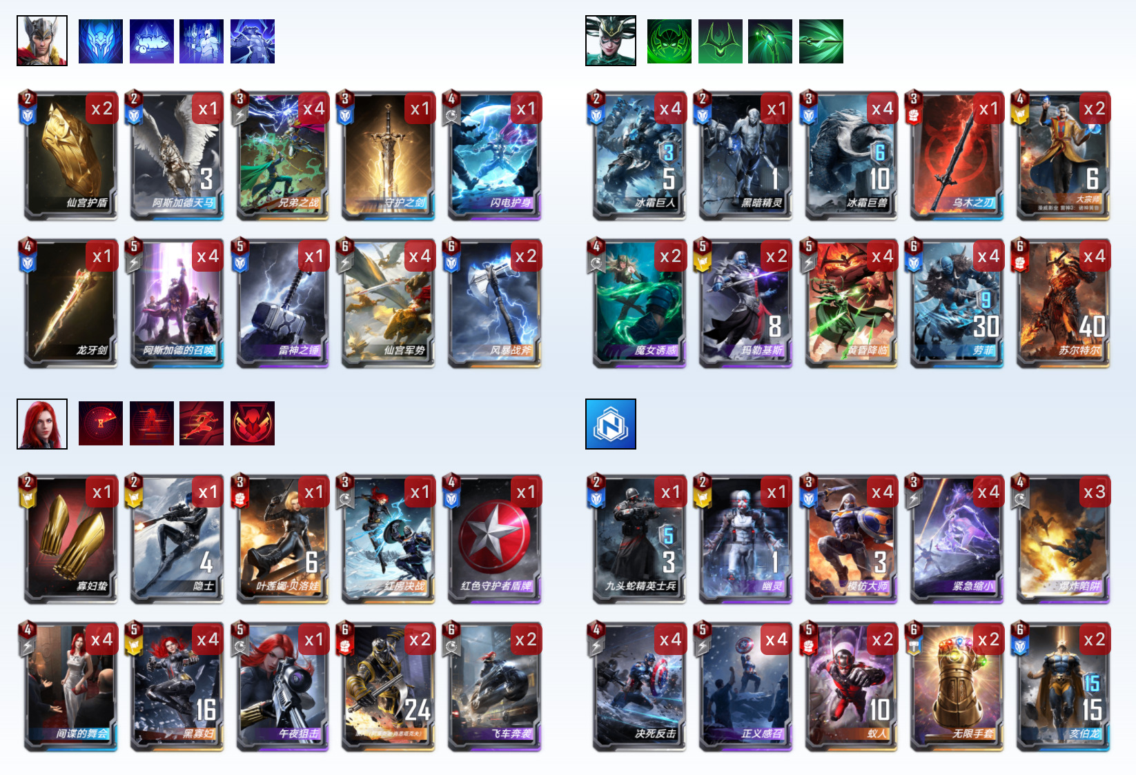 当然我们之前还试过带蜘蛛侠终幕的打法,我自己也研究过带惊队3费坚甲墙还有斯克鲁入侵配合寡妇飞车奔袭的打法。因为雷神终幕最大问题和对手就是穿甲类武器等,一旦被清场就会缺乏后续的致胜手段,所以之前有试过毒液配合蜘蛛终幕等打后手(当然也试过蜘蛛感应免伤看能不能白嫖一次反击伤害等等 结果是不能因为没触发伤害就没办法反击),我自己也试过惊队斯克鲁入侵配合飞车奔袭打后手等不同的方式。