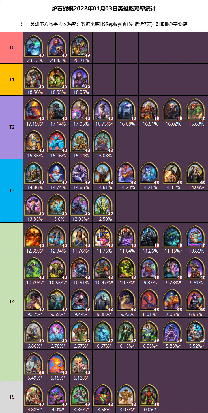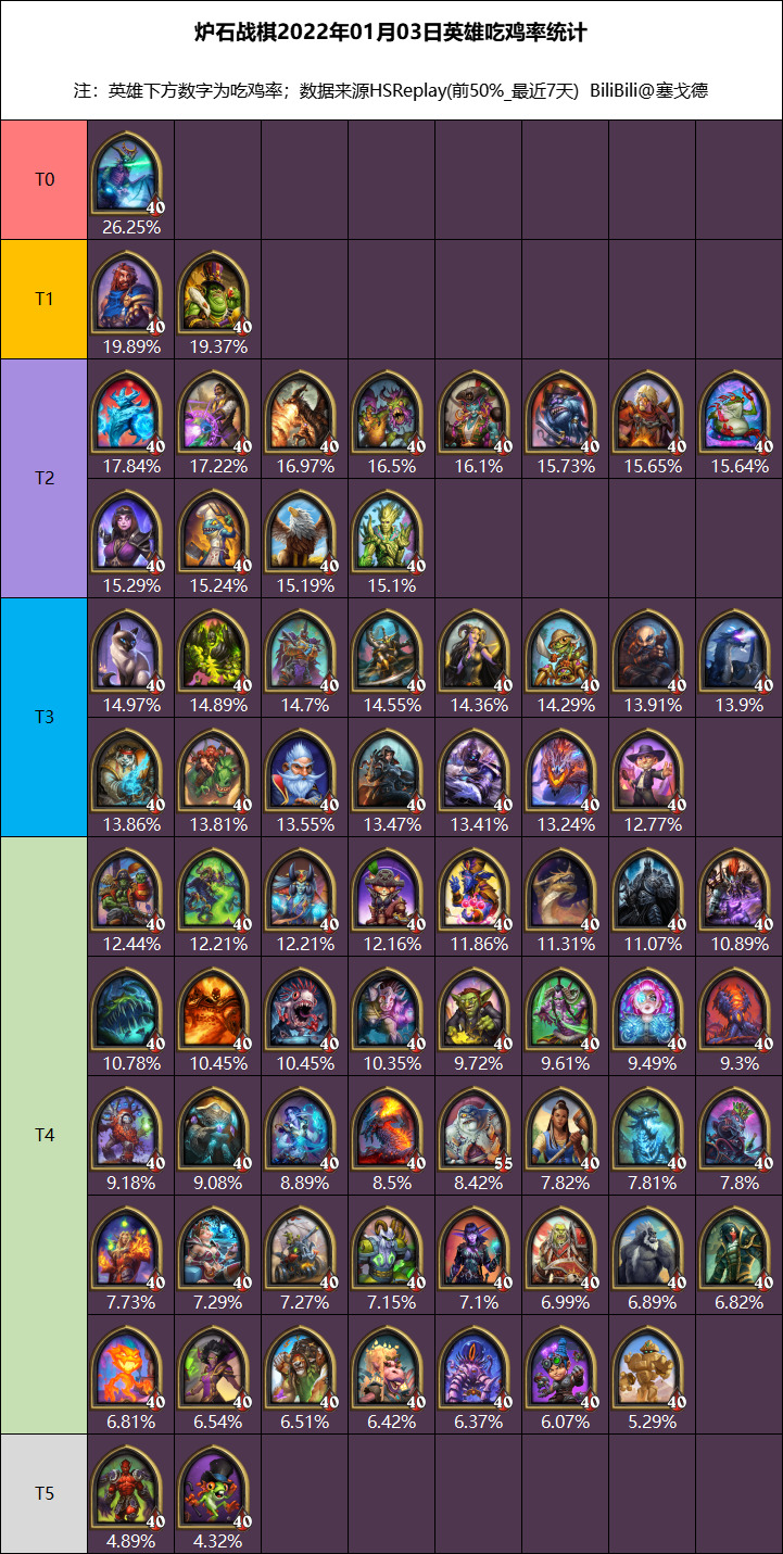 由于光耀之子和增强幼龙的削弱其他流派的胜率都略有上升,体现在英雄上是帕奇斯和菌菇术士均回归前10,但绿龙的稳定性极好,虽然增强幼龙削弱了但由于绿龙稳定找龙的机制,依然在均场排名和吃鸡率上双双走高。