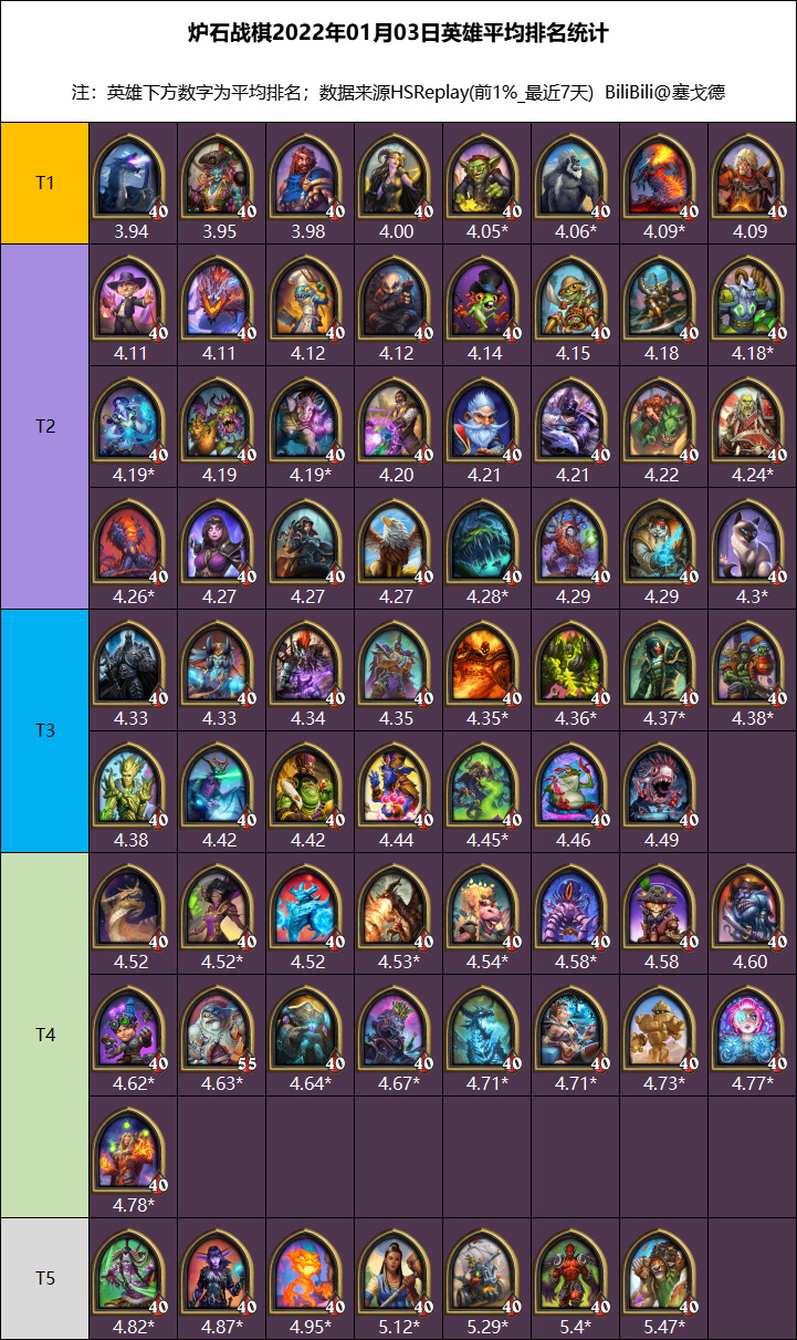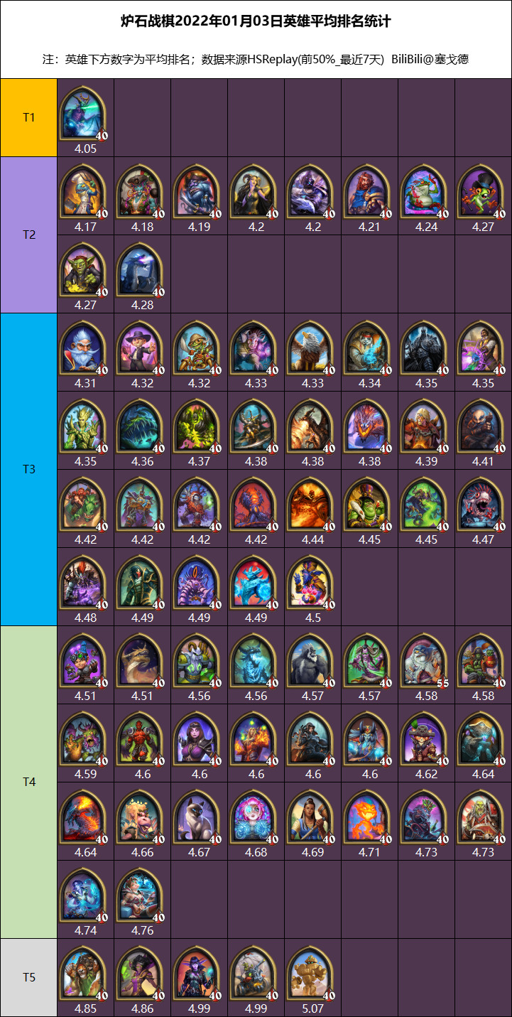 不废话了,来看看本周数据吧,中位局采用前50%以上玩家,积分为6400+,英雄排名一图流,数字为均场排名