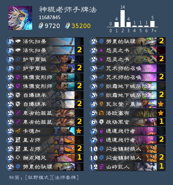 昨天看神棍老师直播玩的手牌法,花式吊打海盗战奇数猎,就组了一套,一晚上从钻十冲到传说。这套打海盗战奇数猎至少80%胜率。