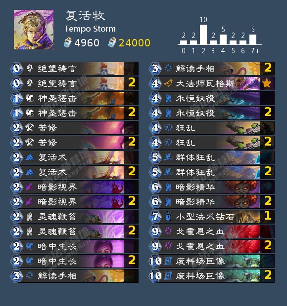 复活牧仍然试图在环境中找到立足点。但越来越多的卡组能够不顾牧师场面直接打出伤害,复活牧依然很难生存。这一问题并非最近才出现。因为复活牧一直以来都是一个狭隘的卡组,很难与组合技卡组互动。随着组合技对手增多,这一问题也随着时间的推进加剧。目前,复活牧只能位于T4。