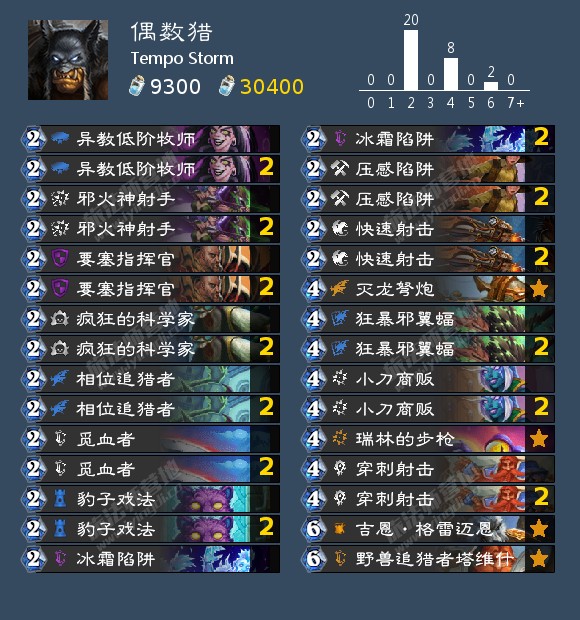 偶数猎有什么变化呢?冰霜陷阱使得许多对手不得不改变策略来应对法术反制效果;觅血者是另一张不错的新卡,既能提供伤害也能加强了控场能力;野兽追猎者塔维什对猎人的后期能力有着意想不到的强化,如果每回合2点的伤害已经不足以威胁对手,那么我们可以改用无尽的动物伙伴来持续进攻。