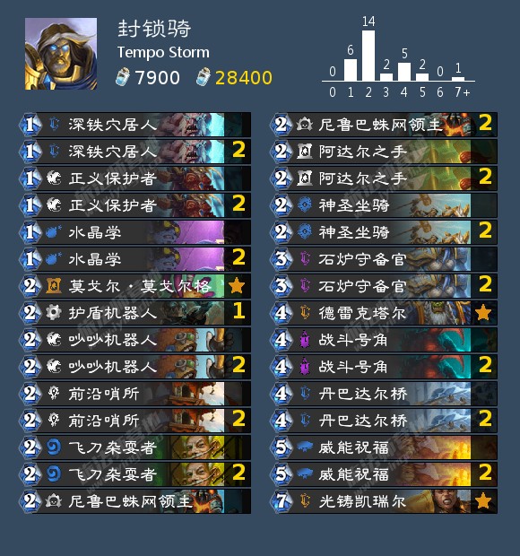 下面的卡组携带了一些针对卡。灰发巫师用于应对奇数猎,有时甚至可以窃取对手的第二阶任务奖励;异教低阶牧师、前沿哨所和尼鲁巴蛛网领主是用于应对法师、盗贼和德鲁伊的套装;脏鼠既是强大的针对卡也可用于应对暗牧一类的快攻;香料面包师看起来可能没那么酷,但她能让我们在对抗奇数猎和暗牧等拥有爆发伤害的卡组时更安全地拍下熔核巨人。