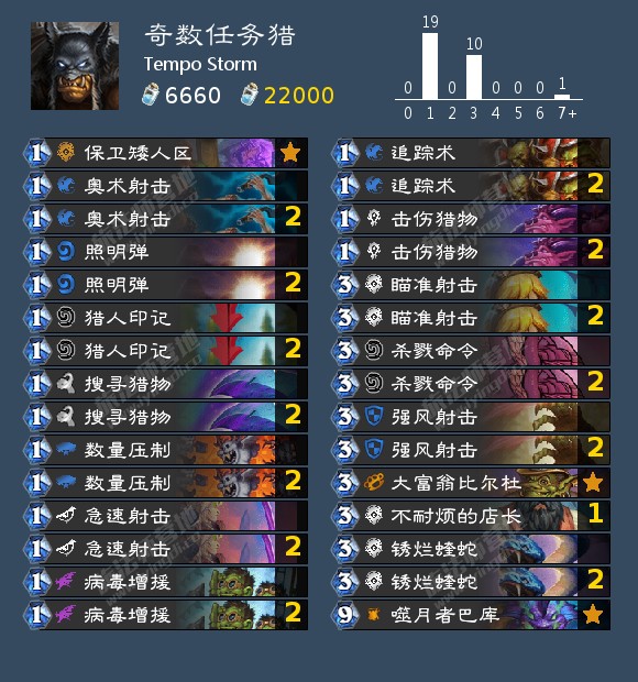 奇数任务猎的构筑在补丁后并未发生改变。我们所展示的构筑是一个标准的模板卡组,三张可交易牌和两张猎人印记是灵活卡位,可以用寒光智者、奥秘图纸、贪婪的书虫、剧毒魔蝎等牌来替换。如果你所处的环境相对较慢、更侧重资源消耗,那么也可以考虑把上面的卡牌加入构筑。