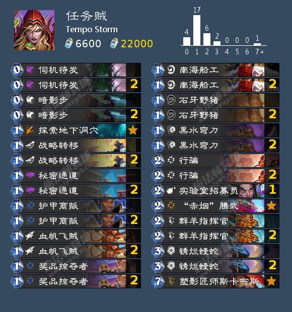 群羊指挥官的加入重新激发了卡组的活力,它和血帆飞贼都能提供两个名字相同的小随从,这也使得卡组放弃了船长的鹦鹉。但是,这个卡组仍然存在一些主要问题。任务贼前期的场面很弱,所以它很容易受到任何形式的攻击。同样,这个牌组也没有拖回合的手段,所以也无法应对点燃法和其他组合技卡组,同时也很难应对奇数任务猎。任务贼可能有机会对抗自残术,因为自残术比过去慢了很多,并且没有太多的嘲讽随从。