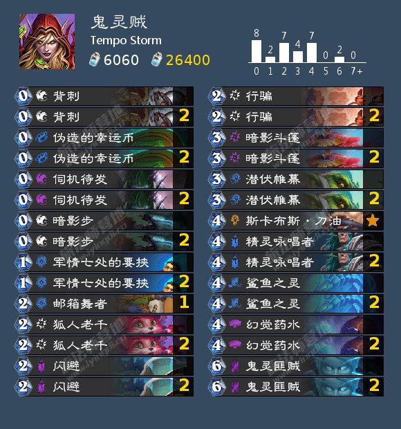 鬼灵贼依然位于环境的T3位置。环境对鬼灵贼很不友好,海盗战、宝宝园和暗牧都是毁灭性的,因为它们使用随从进行施压;冰萨、偶数术和宇宙偶数术都配备脏鼠和前沿哨所来拖慢鬼灵贼的速度。你想要遇到的对手可能只有法师和猎人,其中后者是更为理想的对手。
