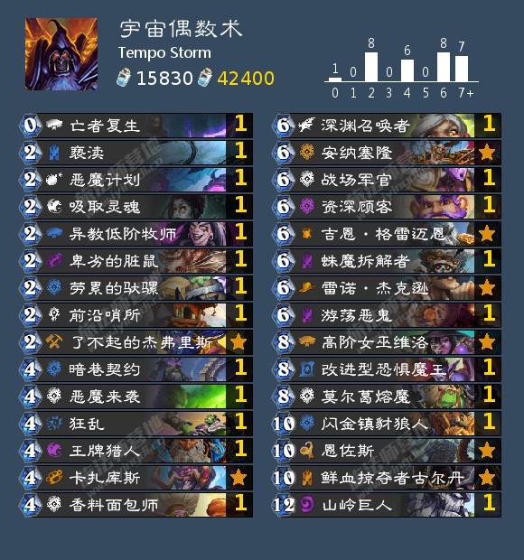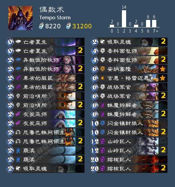 宇宙偶数术在版本初期还算是一个不错的卡组。古尔丹可以调整他的针对卡来应对不同的对手,无论是快攻、组合技还是资源型卡组。这个卡组的强度还是很高的,有一整套的大哥体系,从山岭巨人、熔核巨人到鲜血掠夺者古尔丹的恶魔套装。