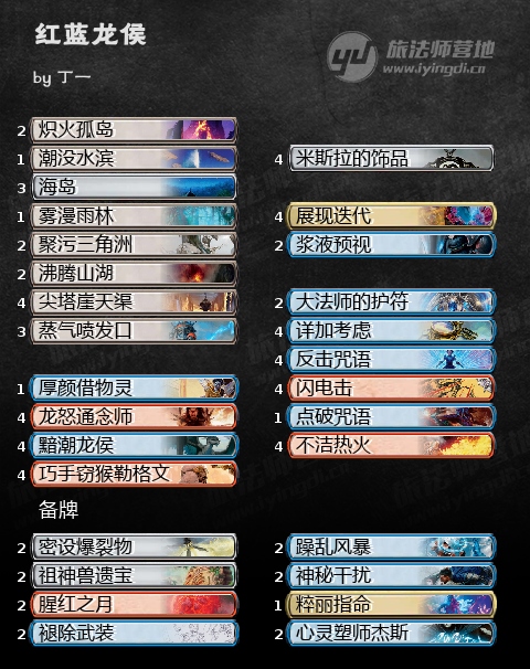 本次比赛选择的套牌仍旧是红蓝龙侯,原因如豆哥采访题所答,稳定、熟悉、强力,最重要的还是好玩,我觉得没什么比这更重要的了。之前尝试过各种版本的4C(元素、旅法师、80张blink),就如我在使用时的抱怨,每张咒语看着都是那么强力,但我就是不知道怎么赢,且自身对这种套牌的节奏有着越发强烈的抵触。后又测试了grixis shadow,这确实是目前效率最高,性能最强的套牌,但是为了各种强力的开局而放弃稳定性的19地套牌,总会让你体会到各种调度的无奈。我无法说服自己适应这种波动,因为波谷确实让人快乐不起来。