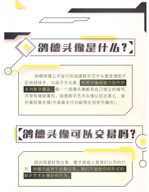 据官方说明,本次鸽德系列头像是由2233个在高能链上建立的数宇艺术头像构成。由哔哩哔哩精心挑选并制作发行,具有收藏价值。其中2000个面向用户发行,233个哔哩哔哩预留(含UP主定制款)每个鸽德头像都有独特的编号及样式,井且含有稀有款。报名时间从2022.01.05 19:00开始。符合用户等级为LV6且在2021年1月1日-2021年12月31日内每日使用哔哩哔哩条件的用户会收到官方私信通知。用户需要年满14周岁并完成哔哩哔哩实名认证。
