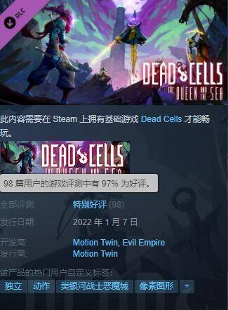 目前Steam《死亡细胞》新DLC评价为特别好评,在98份评论中,好评率达到了97%,有兴趣的朋友赶紧入手体验吧。
