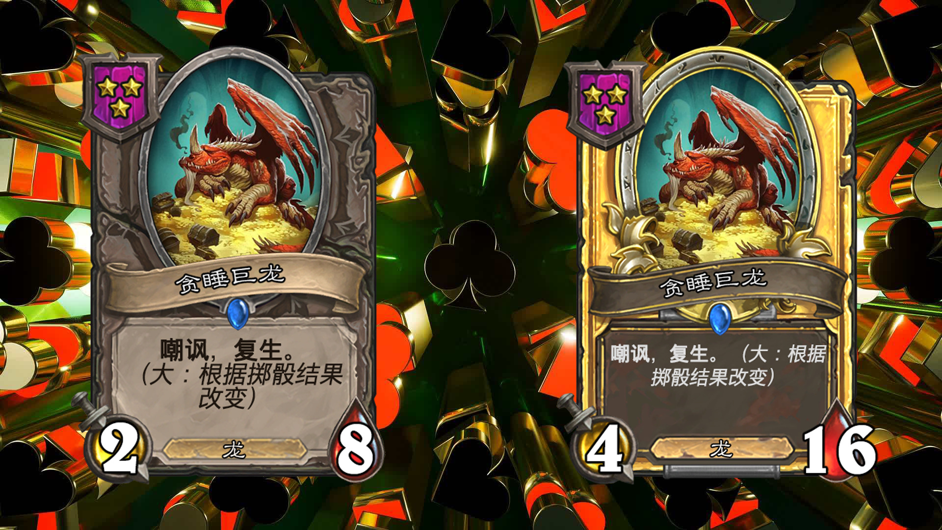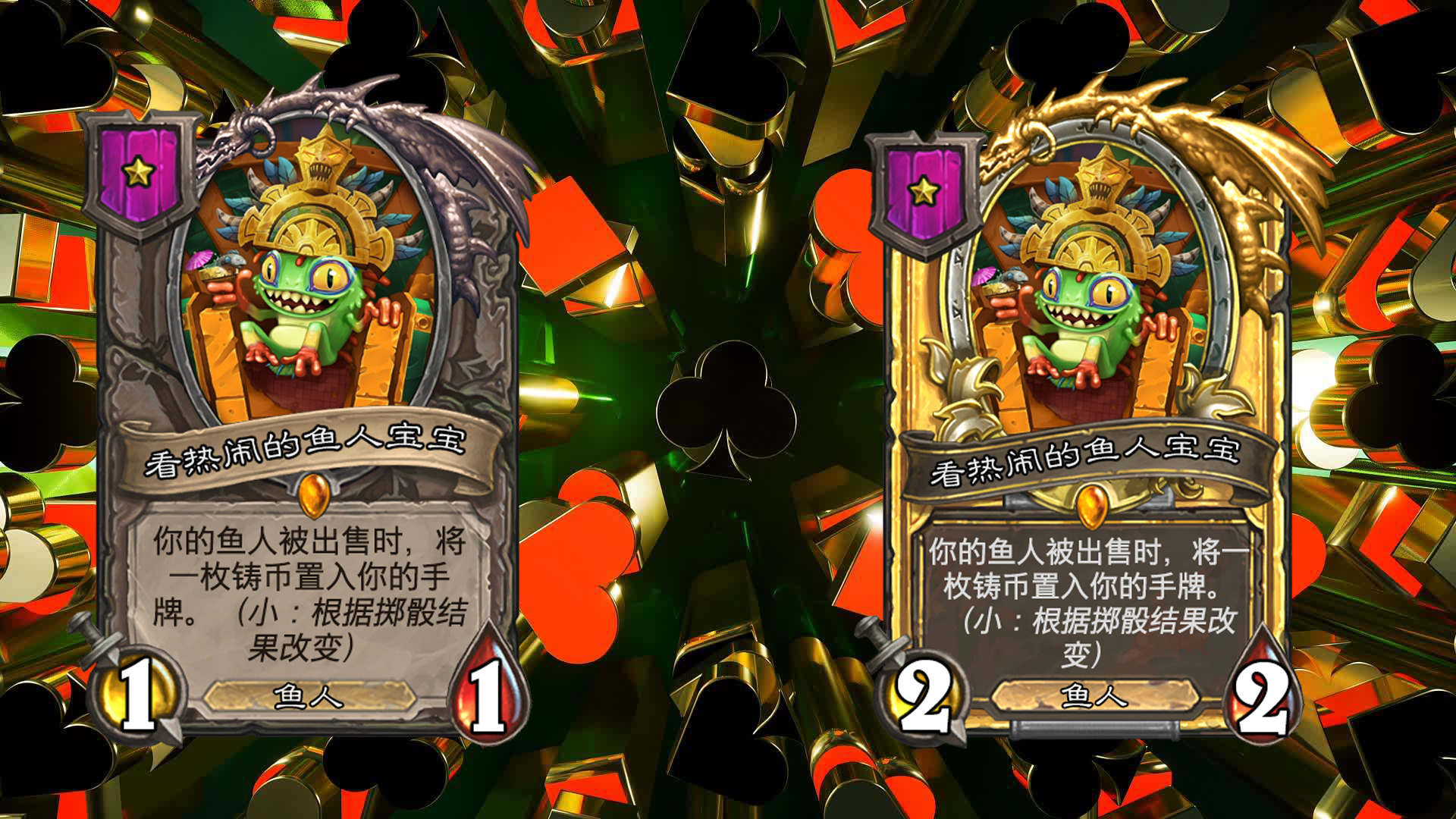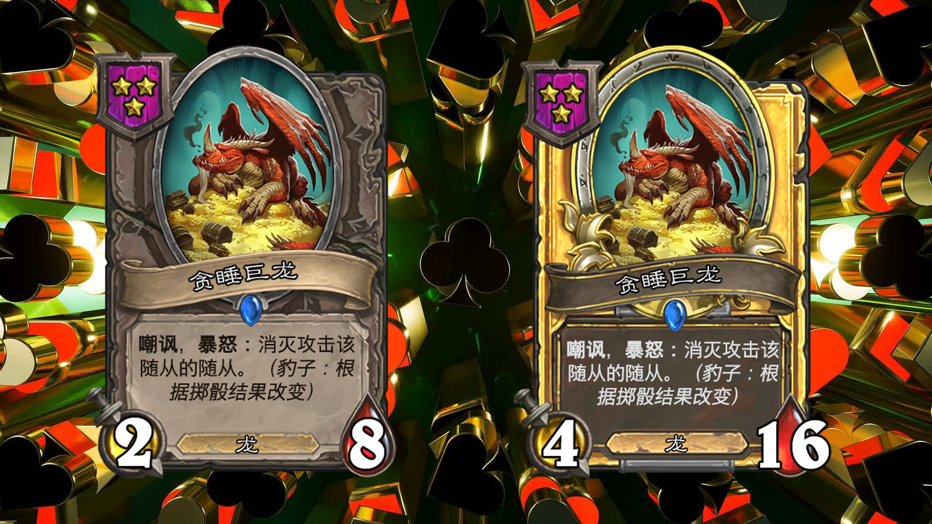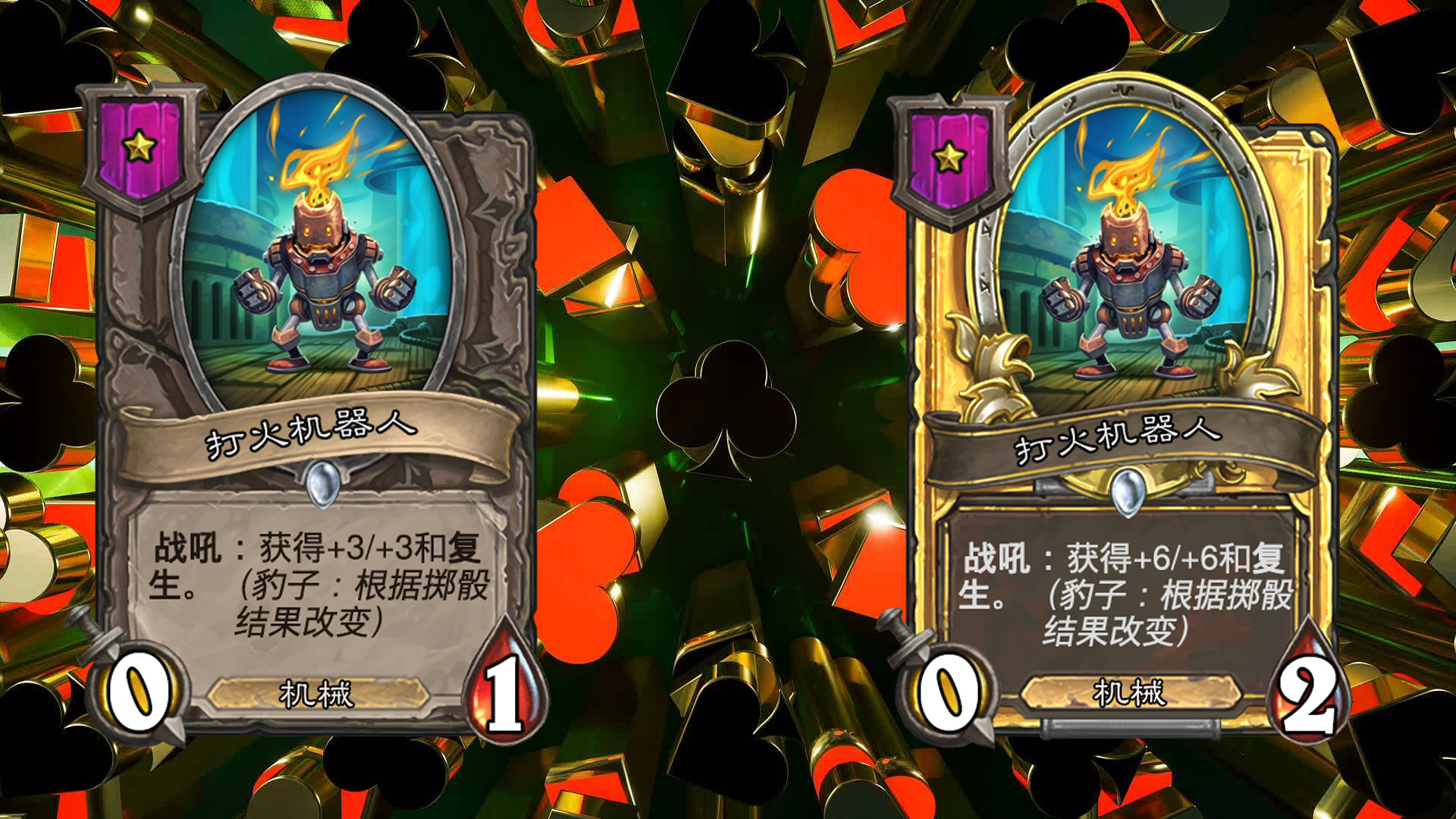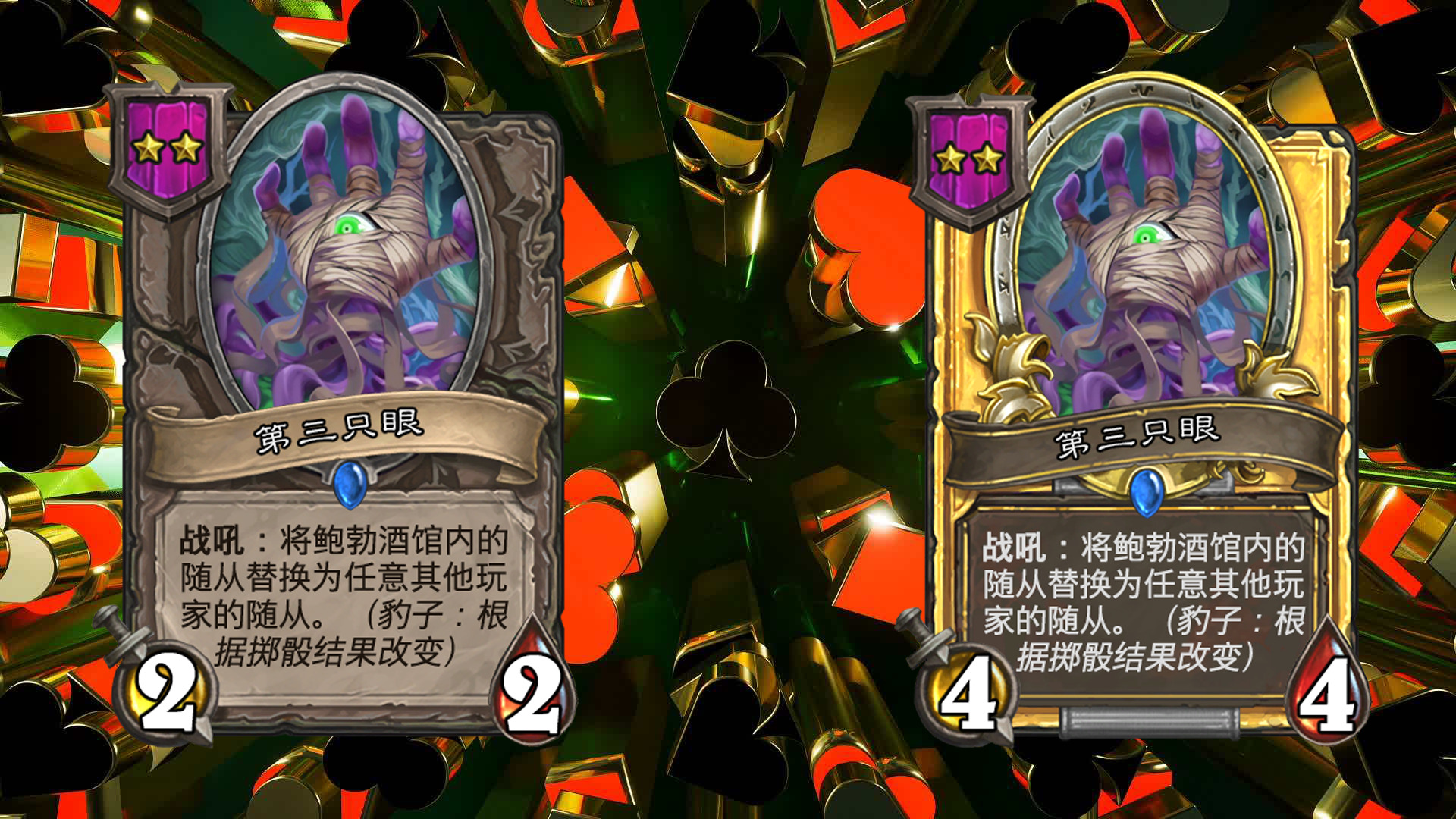 在每回合开始时,进行掷骰,包括大,小,豹子三种不同的结果(每个玩家的结果相同),会对应大多随从三种不同的效果,一般情况下从鲍勃的酒馆购买随从后,他的效果就会固定(即若本回合掷骰结果为小,则永远是小的效果);本回合出售相同结果的随从可获得三枚铸币(即若本回合掷骰结果为小,则出售效果为小的随从时,会获得三枚铸币而不是一枚);不同效果的相同随从三连时,会保留已获得的效果,金色随从的效果与本回合的效果相同。