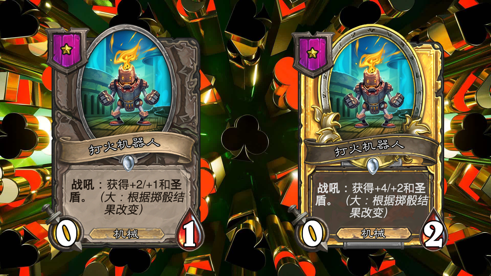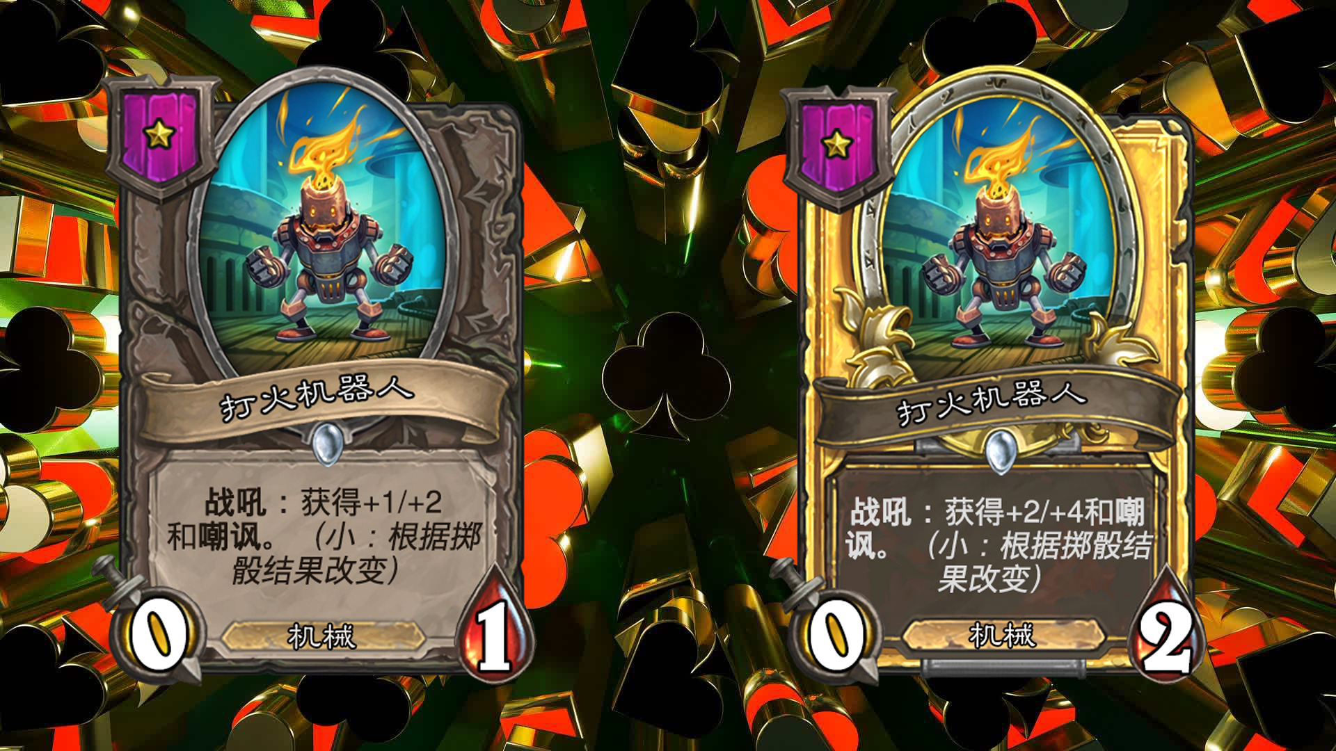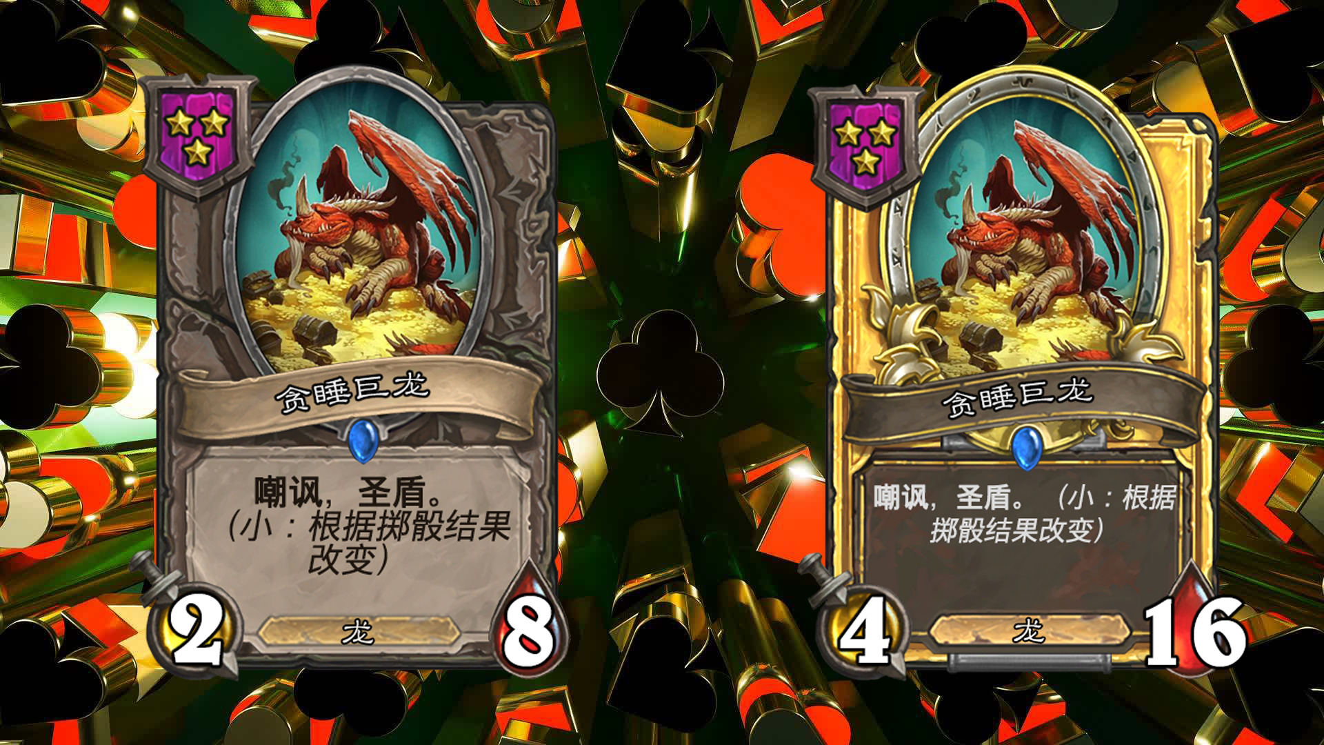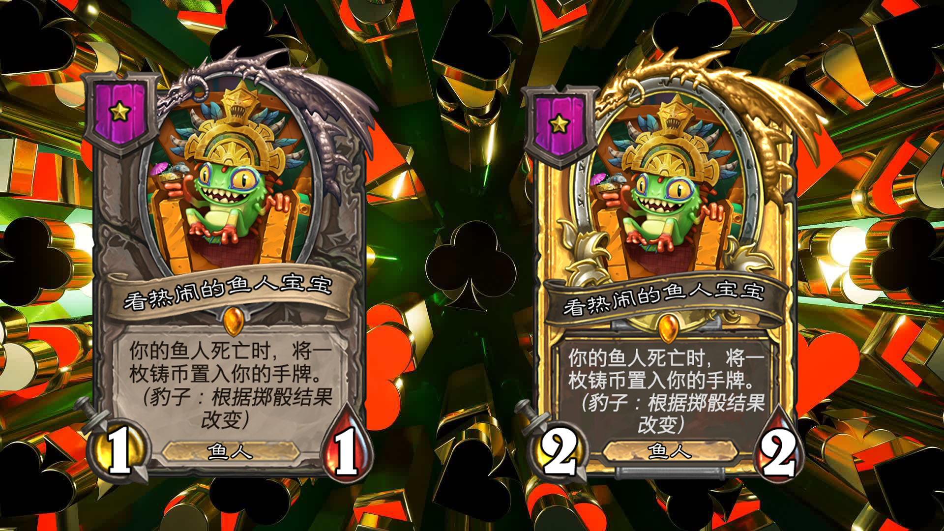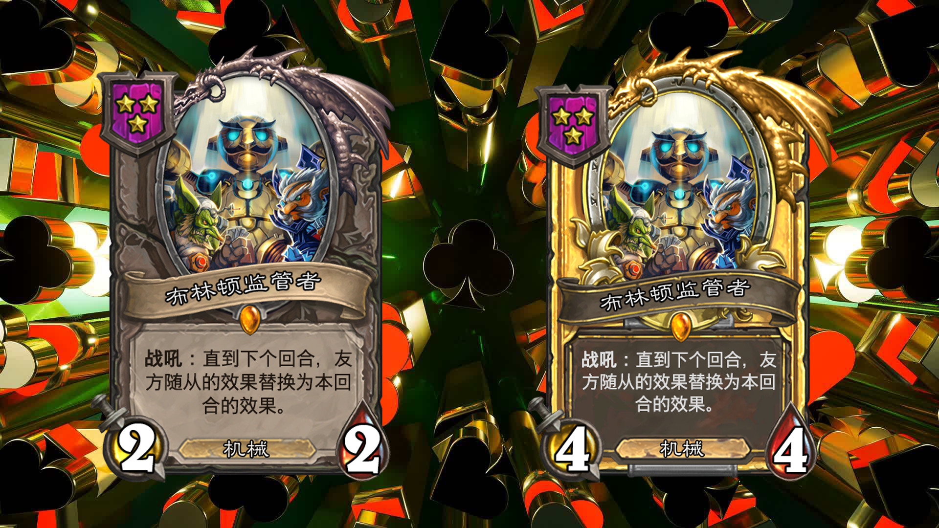 在每回合开始时,进行掷骰,包括大,小,豹子三种不同的结果(每个玩家的结果相同),会对应大多随从三种不同的效果,一般情况下从鲍勃的酒馆购买随从后,他的效果就会固定(即若本回合掷骰结果为小,则永远是小的效果);本回合出售相同结果的随从可获得三枚铸币(即若本回合掷骰结果为小,则出售效果为小的随从时,会获得三枚铸币而不是一枚);不同效果的相同随从三连时,会保留已获得的效果,金色随从的效果与本回合的效果相同。