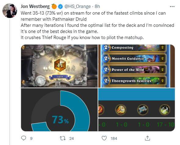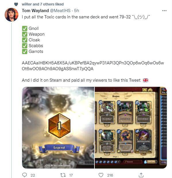 Meati提到将豺狼人、武器、药膏、英雄牌等强力卡牌都放进构筑会如何呢?他表示这是当下最强的刀贼卡组,并且用这套牌以79-32的成绩成功登顶。