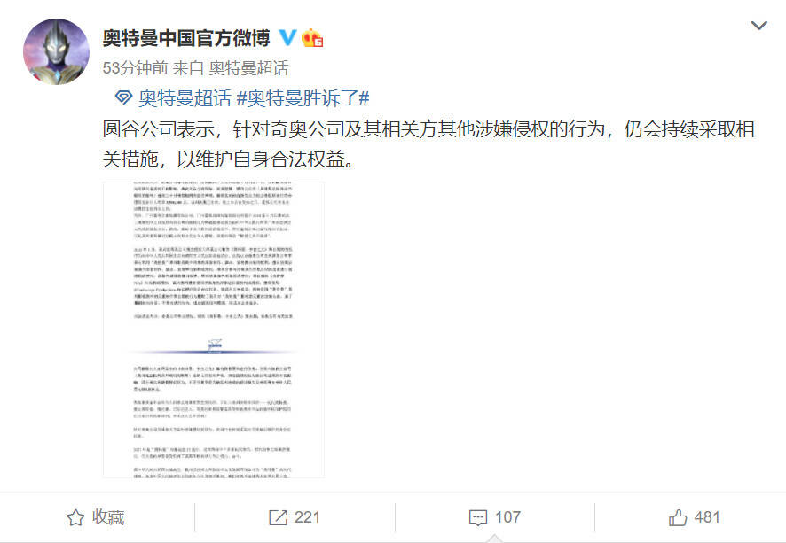 公告显示,法院判决蓝弧公司、奇奥公司需向圆谷制作株式会社分别赔偿250万元、400万元。圆谷公司表示,针对奇奥公司及其相关方其他涉嫌侵权的行为,仍会持续采取相关措施,以维护自身合法权益。