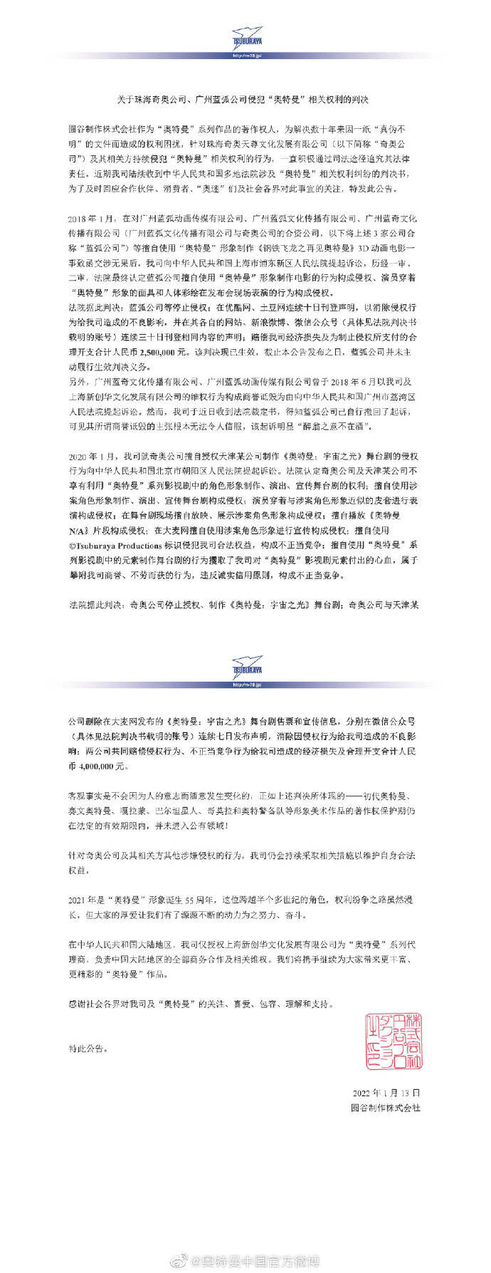 “奥特曼”系列作品著作权人圆谷制作株式会社就珠海奇奥公司、广州蓝弧公司侵犯“奥特曼”相关权利的判决发表公告。圆谷公司共获得650万元赔偿。
