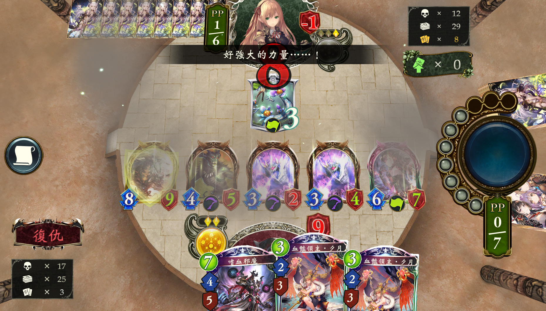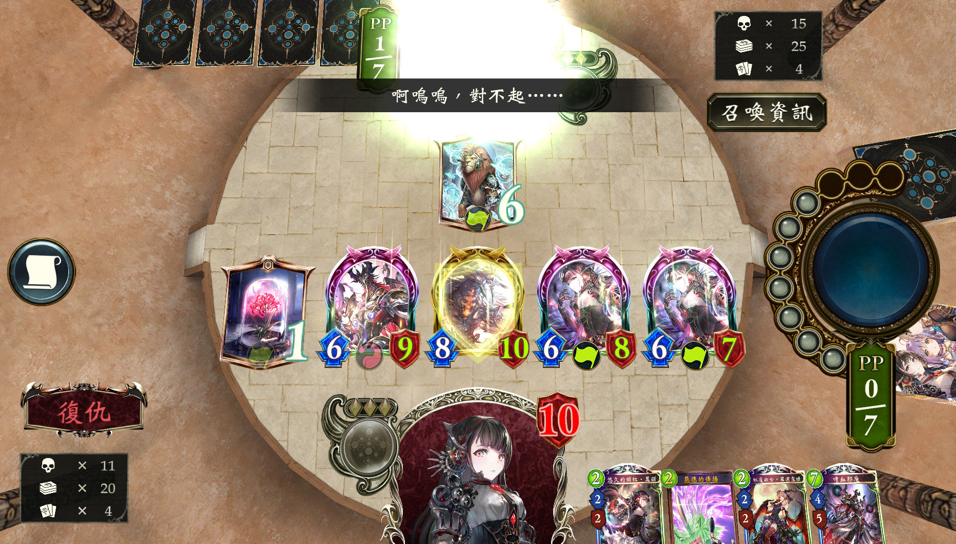 第6回合通过恶德和莫诺返场,并刷够进化。第7回合瞬念召唤邪魔,方舟拉邪魔,配合留下的场攻完成斩杀。