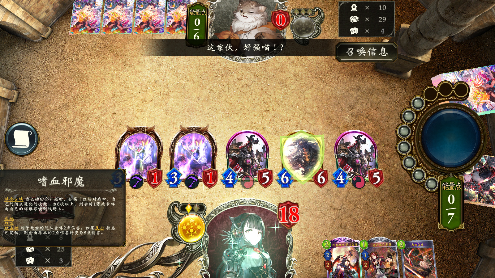 对守护教时,如果难以堆够6次进化,可以在中期通过莫诺返场、刷进化,尝试通过瞬召邪魔完成分段斩杀。方舟能在复仇状态下拉出牌堆中的方舟或邪魔,可以利用这点打斩杀。