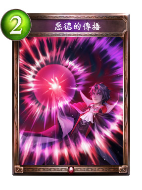 恶德的传播是莫诺的最佳搭档。它能在复仇状态下召唤2/2突进必杀和2个1/1必杀,配合莫诺,便是2费10点场攻。这些必杀随从不仅能与莫诺一同打脸,还可以过墙,为莫诺扫清障碍。在场地不足的情况下,恶德召唤的突进恶魔还可以在使用莫诺前送掉,用法非常灵活。