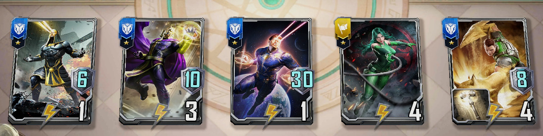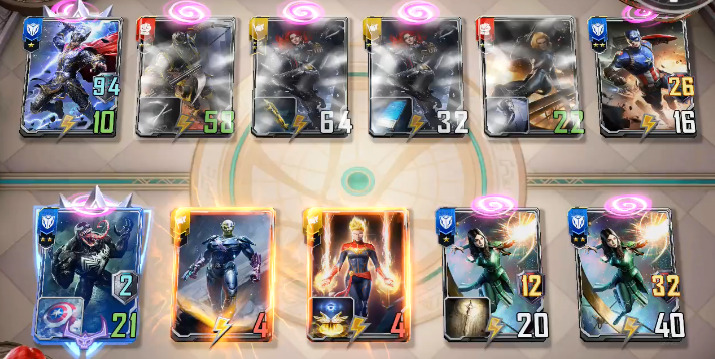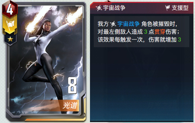 但站位严格,需要按照塔洛斯、斯克鲁士兵、惊奇队长这样的顺序来站位(不需要紧挨着,顺序左到右这样就可以了,中间可以穿插幻视等卡),只要塔洛斯先动能送掉,开局就能3连动。至于为什么可以动3次可自行查看先制的描述