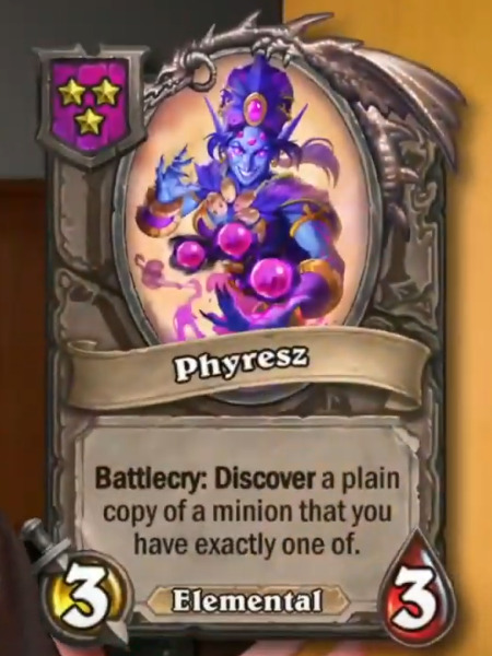 - 普通伙伴:3星3/3元素,战吼:发现一个你只拥有一个的随从的原始版复制。
