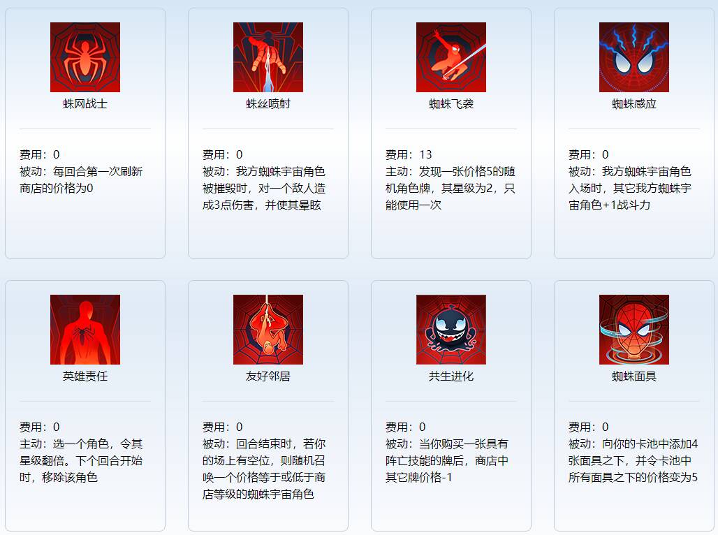 蛛网战士,蛛丝喷射,蜘蛛飞袭,友好邻居。这四个技能的推荐度较高,英雄责任的需求性较低,所以没有携带。