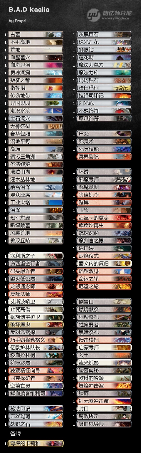 比起洁丝卡+织命这样保证下限步步为营的马尔都构筑,卡莉雅玩家的牌表几乎是把一个“疯”字写在了脸上:毕竟谁都不想在倒胃口 的时候连翻窥探深渊 +拉扎柯。但事实上这些CMC超大的恶魔们每个都配合卡利亚支持起了一条极其难被干扰的获胜链——拉扎柯配合库杜沙再生 一键找齐combo、符痕恶魔 扮演的大号觅咒师 、毁灭低语魔 配合寇利斯之子 能几乎磨穿自己的牌库来找到冥界裂隙 +塞文内的复归 、还是维利司提供的解场以及极高地抓牌收益。由于穹境的卡莉雅 的结算并不能等同于“对手手里有足够致胜的关键“,以及对于非蓝色组自我保护能力的普遍轻视导致绝大多数牌手都会把那些对自己造成干扰的生物(如集宝奥夫 、伊美黎统领 )的处理优先级放在收益明面未知的卡莉雅之上,导致比起娱乐局之外卡莉雅更容易活过维持;而这一条件也使得了除了极速倒胃口 或窥探深渊 以外卡莉雅主将本身成为了本套牌中别具风味但收益惊人的单卡计划。