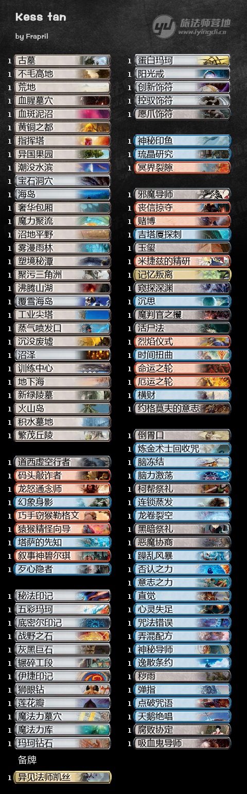 但凯丝的缺点从CMR发售之后也愈发的明显:首先她并非是一个无脑出的主将;这意味着相比起寇姆、泰维司刹特这样的自带收益的高费主将,在没有如洁丝卡的意志 、沉思 、吸血鬼导师 或是直觉 这样的combo或者value单卡时凯丝速出的收益会显著降低。其次便是凯丝对于调色的要求使得她很多时候无法强求速度;作为现在为数不多三色硬性十会盟循环印记的主将,凯丝对于法术力需求不仅仅在于数量,并且也在于颜色本身。作为凯丝玩家我清楚地了解这个有着大量法术力神器加速的主将在出主的那两个回合对于有色法术力究竟是多么的渴望,且同时伴生出的决策点有时候就左右着这个"turn 3 game"的输赢。
