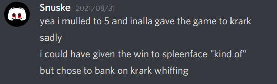 Snuske的激进调度几乎是明牌的“我手中有强力互动”,而阿典也并没有贸然在二回合就启动——但是2号位的因娜拉选择在一个最不该启动的时间点在没有任何保护的情况下打出觅咒师 combo并且吃了snuske的打断,而这使得后续游戏对于Snuske变成了“选王”(Choose a king)。根据顺位,他理所当然的和拇指逆岛一起阻止了阿典,但这也让拇指逆岛毫无压力的赢得了这场游戏。