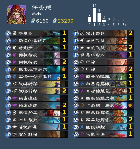 安戈洛时期的任务贼还得靠火羽精灵做任务,但现在有两张可以一卡生成两张衍生物的血帆飞贼和群羊指挥官,下文简称材料卡,所以起手优先去找这两张卡,3费之前有就可以平均5费开任务。有了一张卡就可以去找回手组件,暗影步优先级最高因为可以省费用。伺机待发我几乎都会留,可以更早开任务,尤其是打战士,只能搏个梦想。其余的卡没什么好说的,我是将系统组的卡组里的背刺换成了扫帚,去掉了小熊猫带上了暗影斗篷,调整期间还带过甩笔侏儒,蛇发女妖佐拉,葛拉卡爬行蟹,迅影匠师斯卡布斯(英雄牌),闪避,感觉效果都差不多,该打不过还是打不过,比厚度该比不过还是比不过,还不如为了制胜点而去组牌,少一些针对牌。保留一张加基森摆渡人是因为这个不是战吼,军情七处的要挟用来解船载火炮和南海船长/迪菲亚炮手,其实也不咋能抽到。