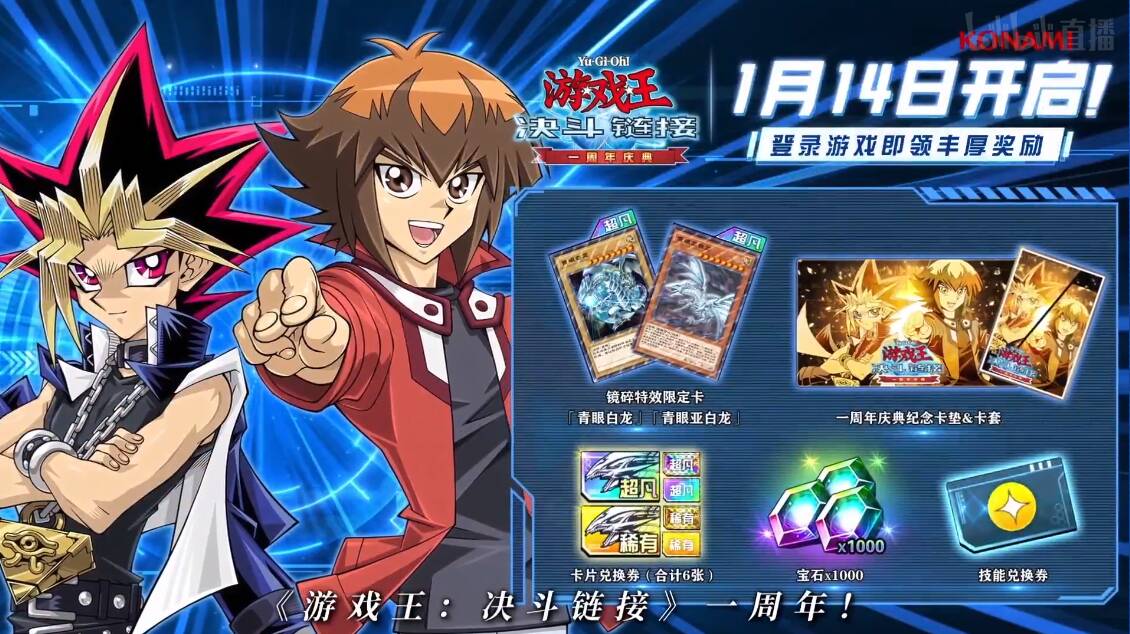 游戏王决斗链接DL国服1周年活动将于1月14日开启,登录就送镜碎青眼白龙(地球卡图)和青眼亚白龙、纪念周边和宝石等。