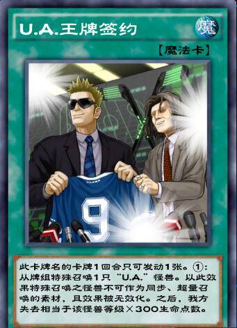 那么可选目标比较了下,U.A.系列就很不错,本家有着可卡组拉怪的王牌签约,拉出6星怪兽扣1800血后,正好满足技能可用的条件。唯一担心的就是本家怪兽上手直接变为废件。所以建议投入魔法3怪兽2。