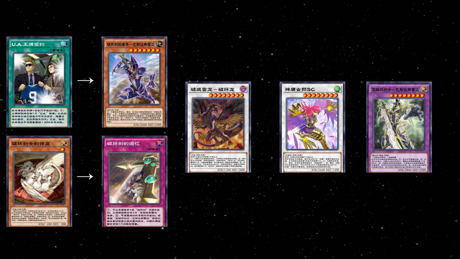 最佳起手就是王牌签约和破坏剑伴龙+任意两魔法,签约拉出6星UA怪兽开技能变成破坏剑士高手,通召伴龙检索追忆,接着两卡同步召唤出破戒蛮龙,蛮龙复活破坏剑士高手,伴龙丢弃追忆特召,继续调星8星同步怪兽,最后除外墓地的追忆发动效果,除外剑士和伴龙融合出龙破坏剑士,终场三大怪两后场。