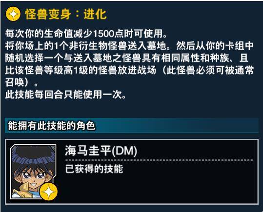 接着再讲讲技能选择,命抽依旧很实用可以选。这里推荐一个不太常见的技能,怪物变身进化,作用是让自己场上一只怪兽进化为同种族同属性高一等级的怪兽,这样就可直接拉出地属性等级7的破坏剑士高手了。