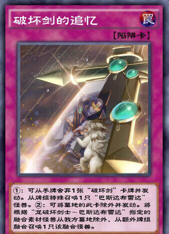 破坏剑的追忆是调动卡组破坏剑士的强力陷阱卡,同时还能处理卡手的破坏剑士本家卡,使用另一个效果还能墓地融合破坏剑士成为龙破坏剑士,它解决了破坏剑士登场困难的大难题,所以必须满3。