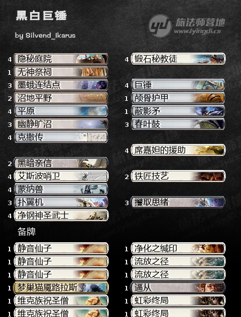 在大锤补齐了这几张牌后大锤在mo上跻身一线并且十分活跃,在看到队友兼好友的知名主播王嘉年在某次卡豆周冠使用这套牌后,我萌生了组一套的想法,点齐组件后就开始了我的大锤之路。在最近1个月的卡豆周冠比赛后,我发现卡豆的meta是4c+阴影+少量大锤,我在实测中发现亲信在对战很多套牌时都非常得好(除了小红)。因为大锤主牌没有去除,这样2回合亲信直接会将优势扩充的无限大,其他套牌看到亲信也会立刻去解,这样会给你套牌里的其他生物带来输出空间。这是我一定要放亲信的原因,元旦卡豆的邀请赛,我主牌用的是1塑铁军之天赋 1寇族验装兵,在使用下来后发现效果并不好,并且上周在和王嘉年聊牌的时候他推荐我用两个铁匠技艺,这牌可以躲避幽寂和怒火,我觉得十分有道理,就把天赋和验装兵去掉了。最后总决赛过程中铁匠技艺确实发挥了不小的作用,有几盘帮助我直接拿下对局,十分感谢好友的推荐。备牌本来有两个恶意骑士,但元旦邀请赛的时候我不止一次遇到了以下情况:我出骑士后对手出了欧纳斯,我虽然反白辟邪,但身材打不过欧纳斯,只能罚站,这牌最终还是不如反白生物彻底,直接换成更直接针对4c的第三个静音仙子以及一个神器结界去除,最终牌表如下:
