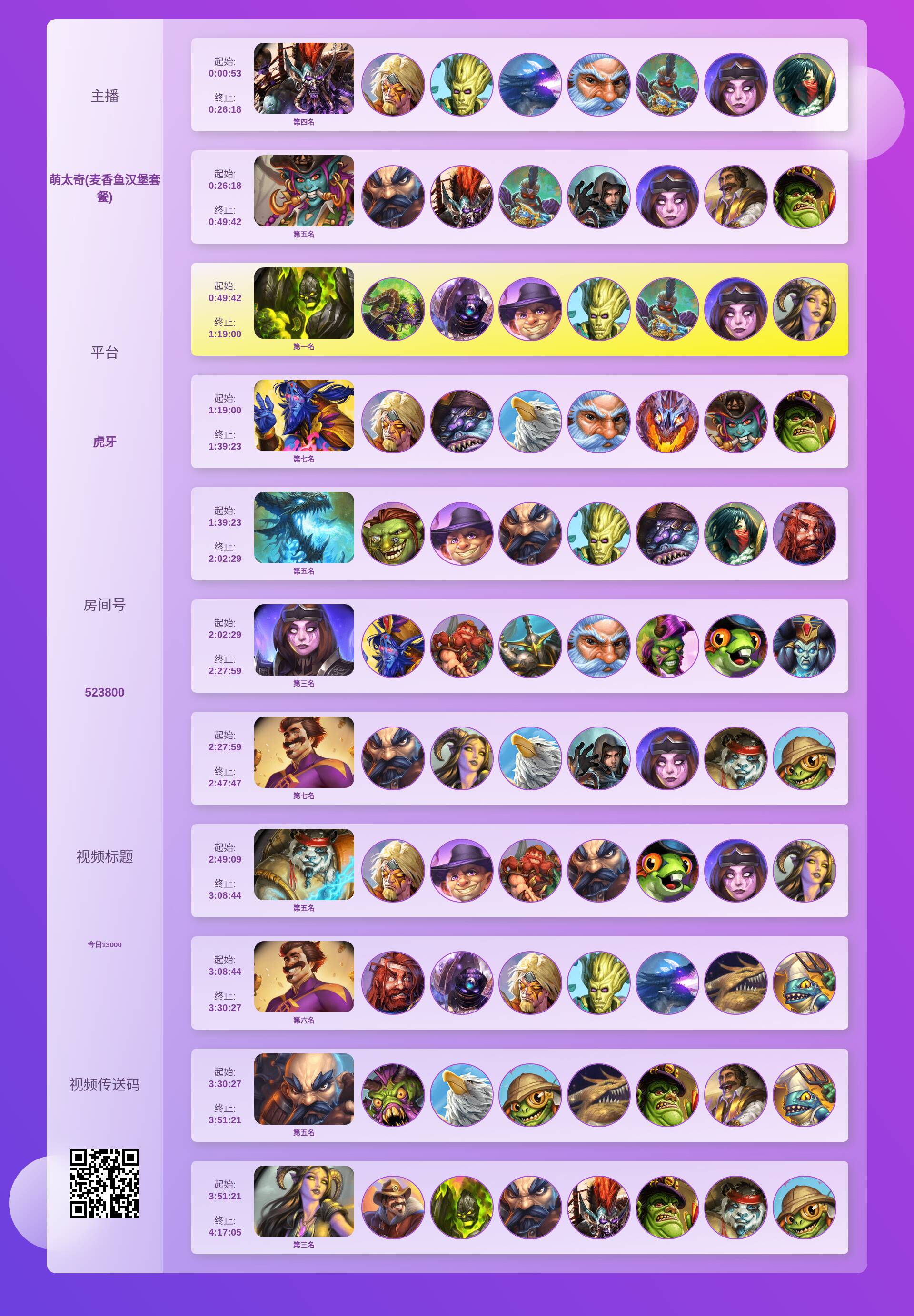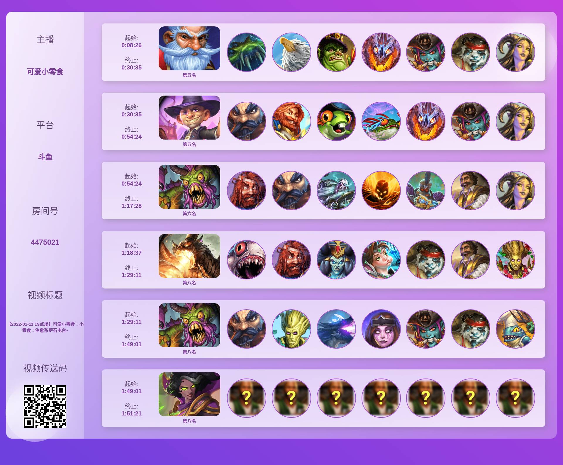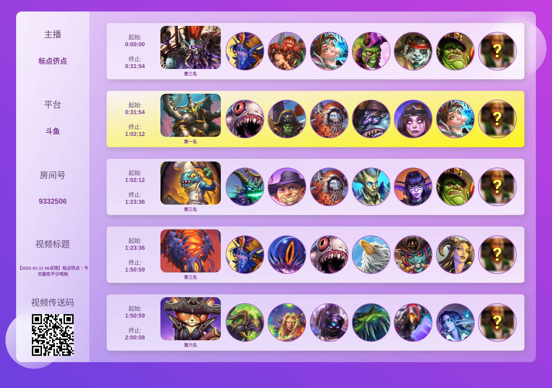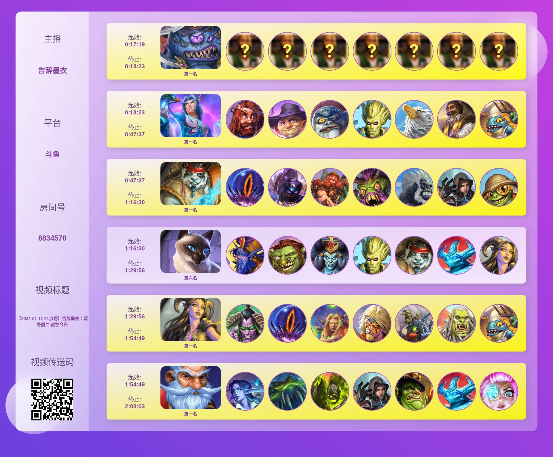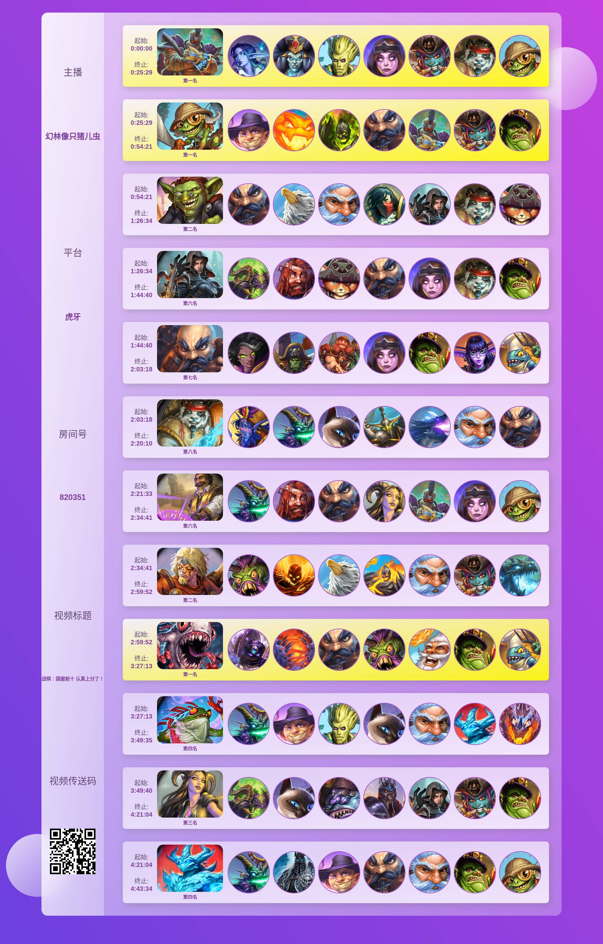 不完全统计炉石战棋直播录像战况,主播顺序完全随机。
