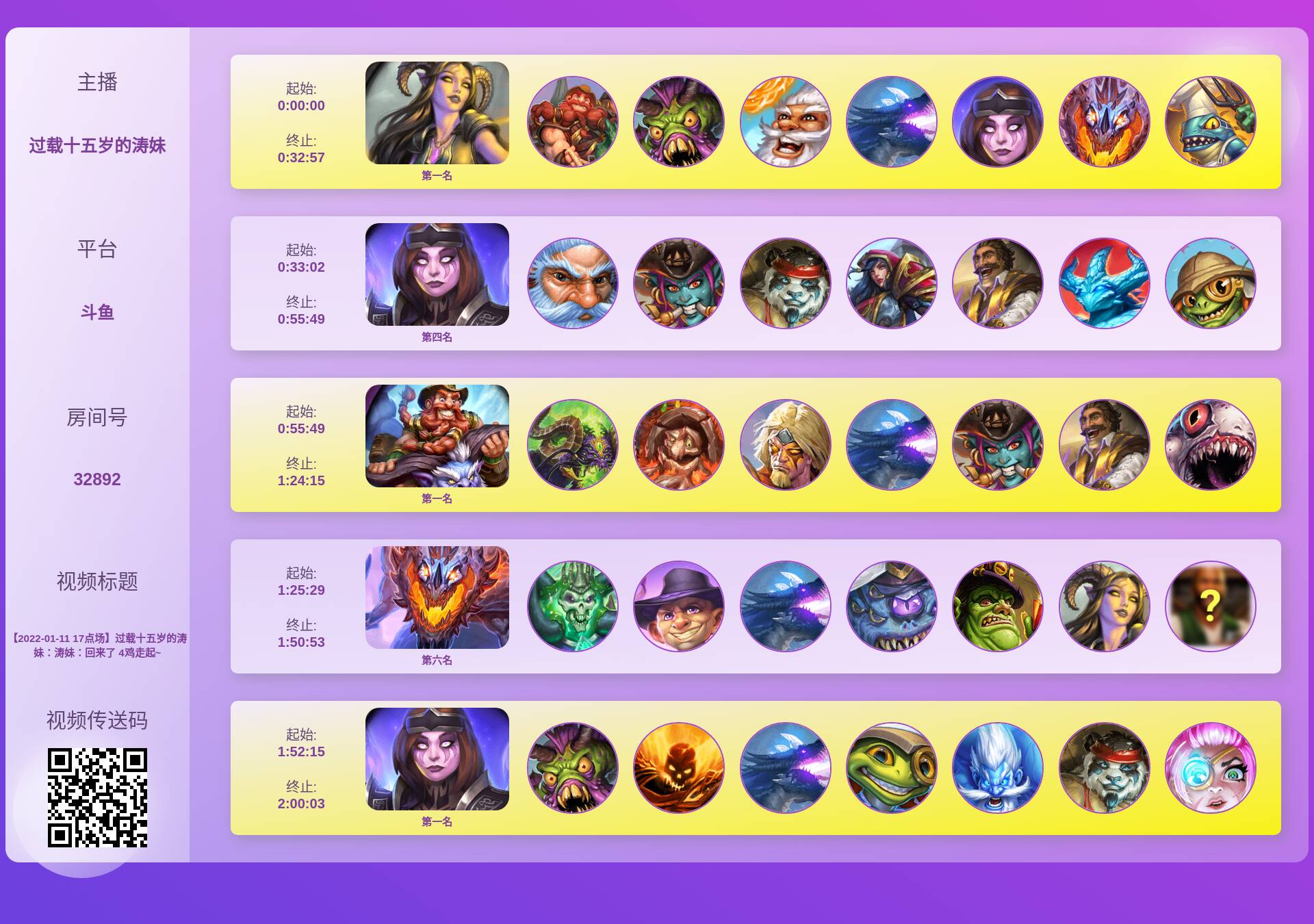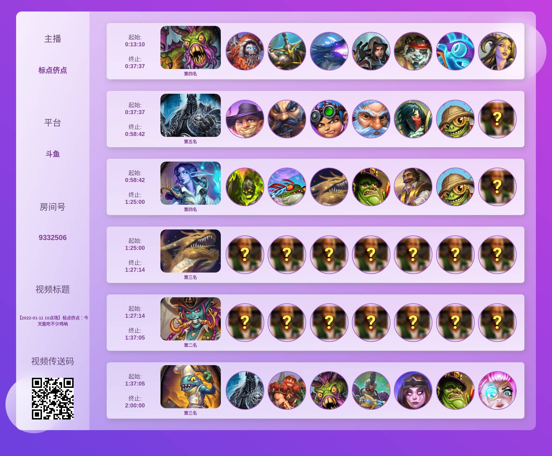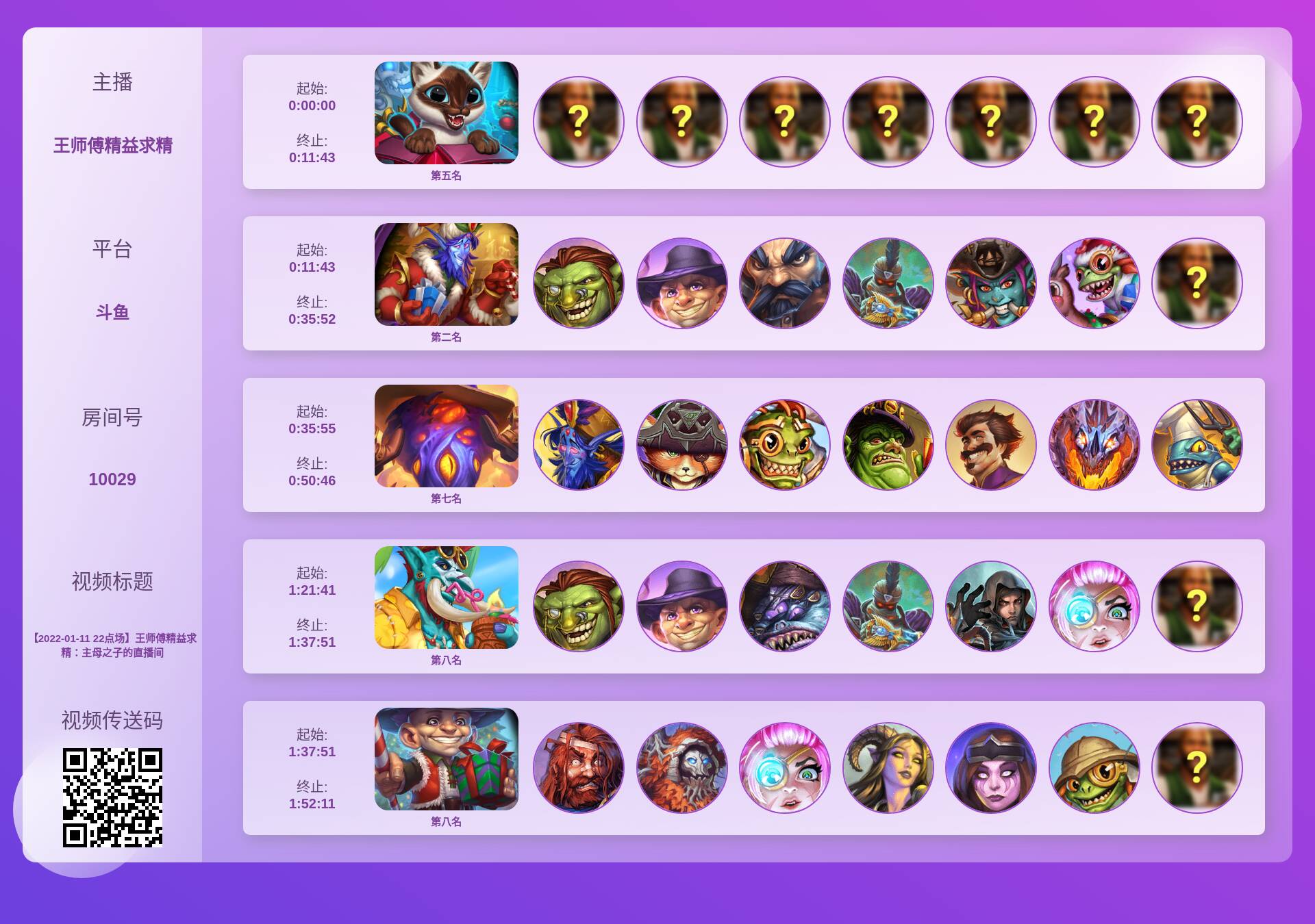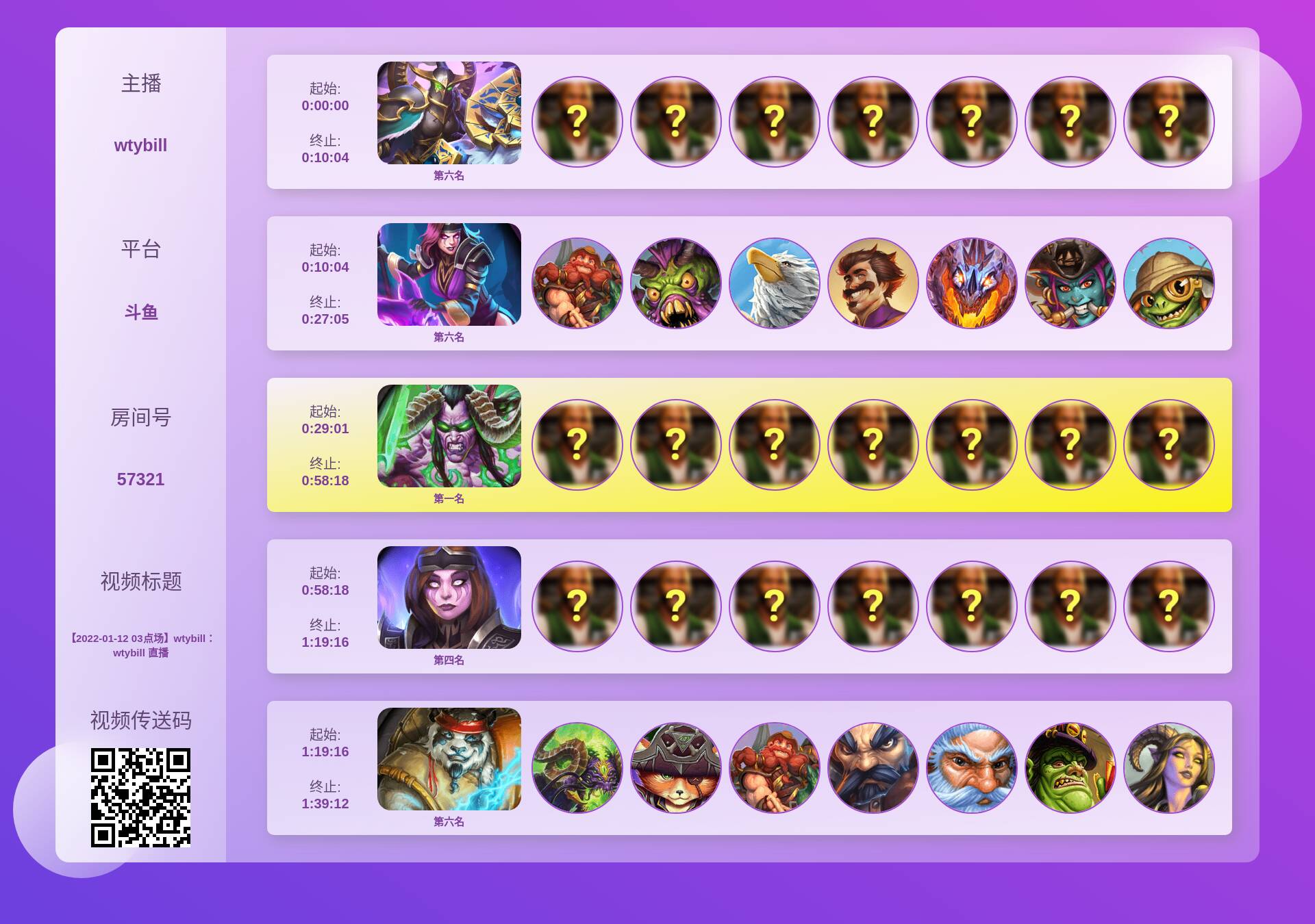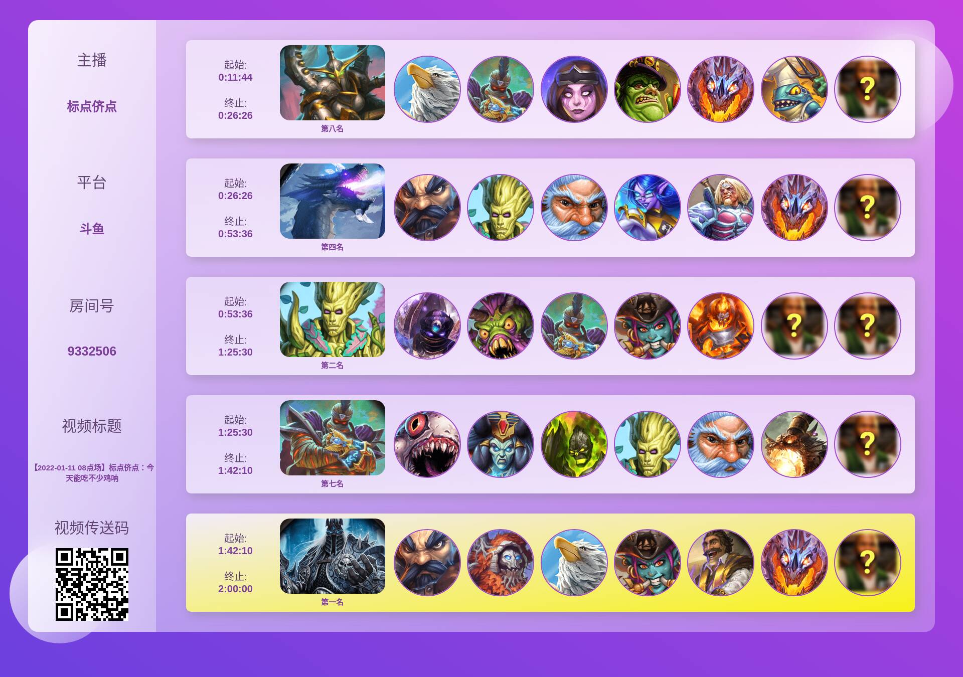 不完全统计炉石战棋直播录像战况,主播顺序完全随机。