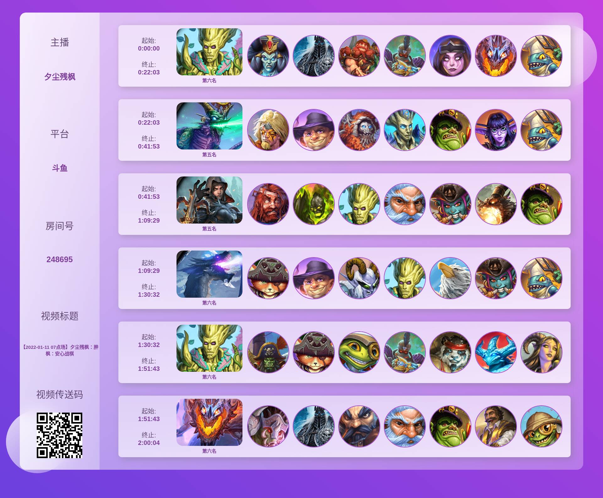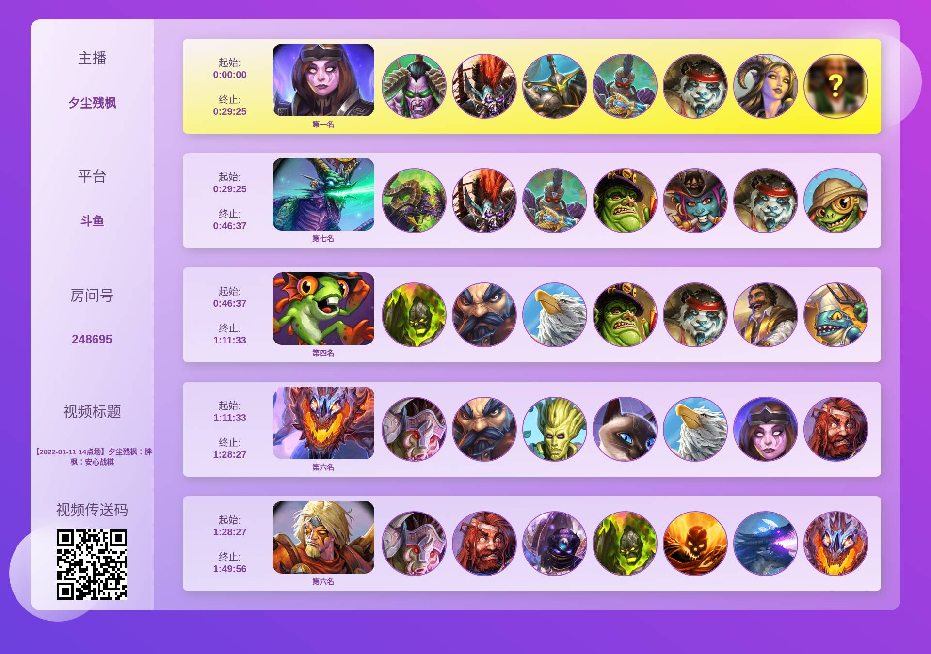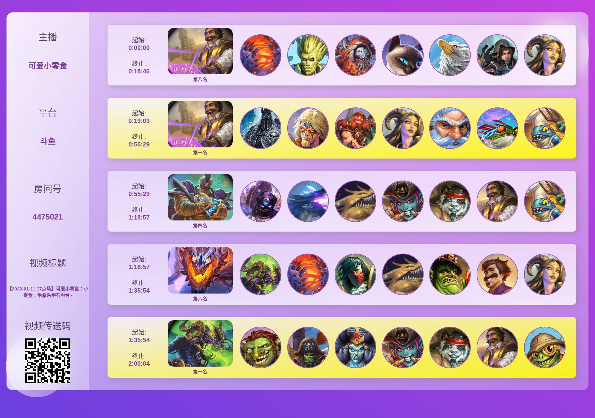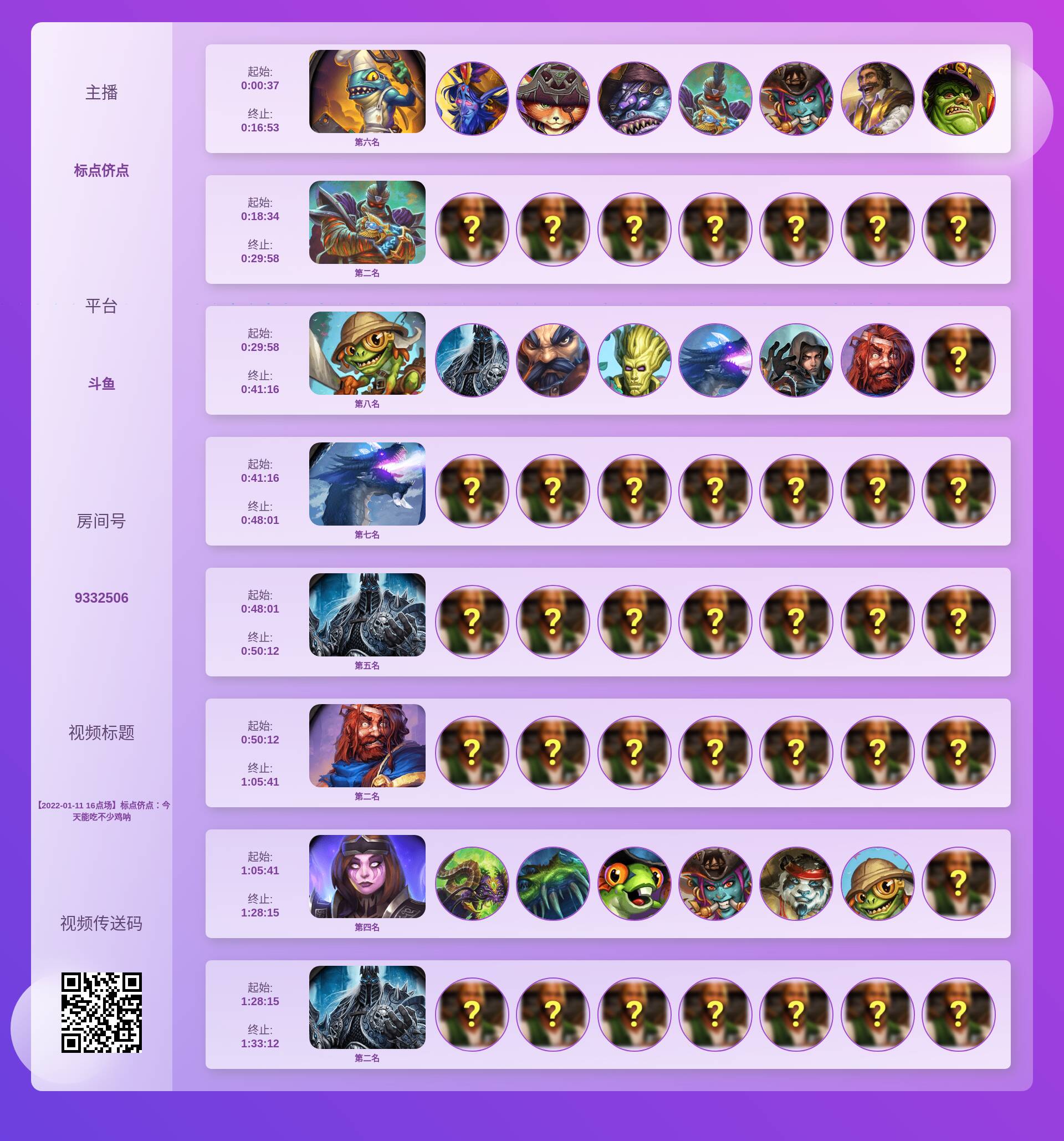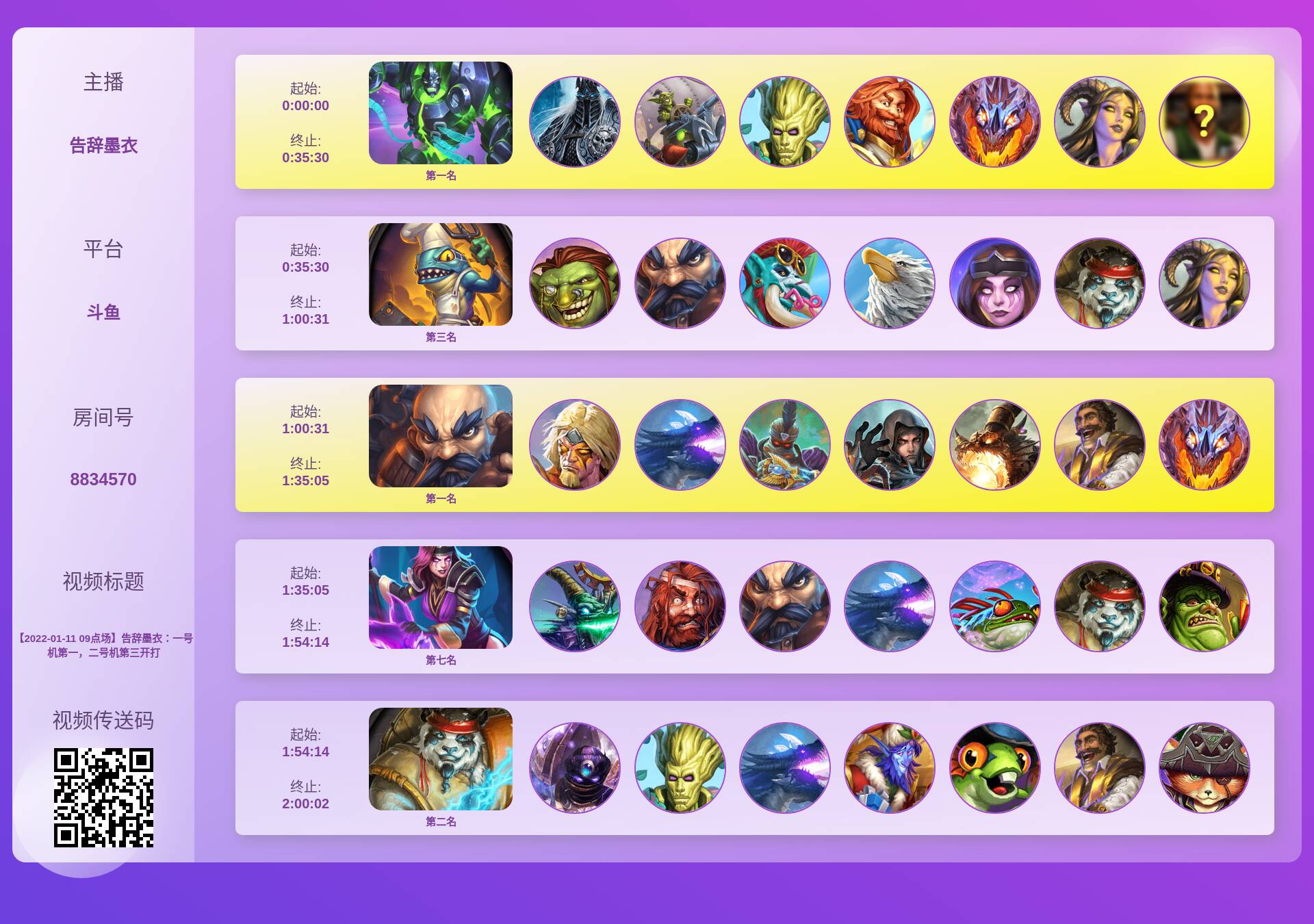 不完全统计炉石战棋直播录像战况,主播顺序完全随机。