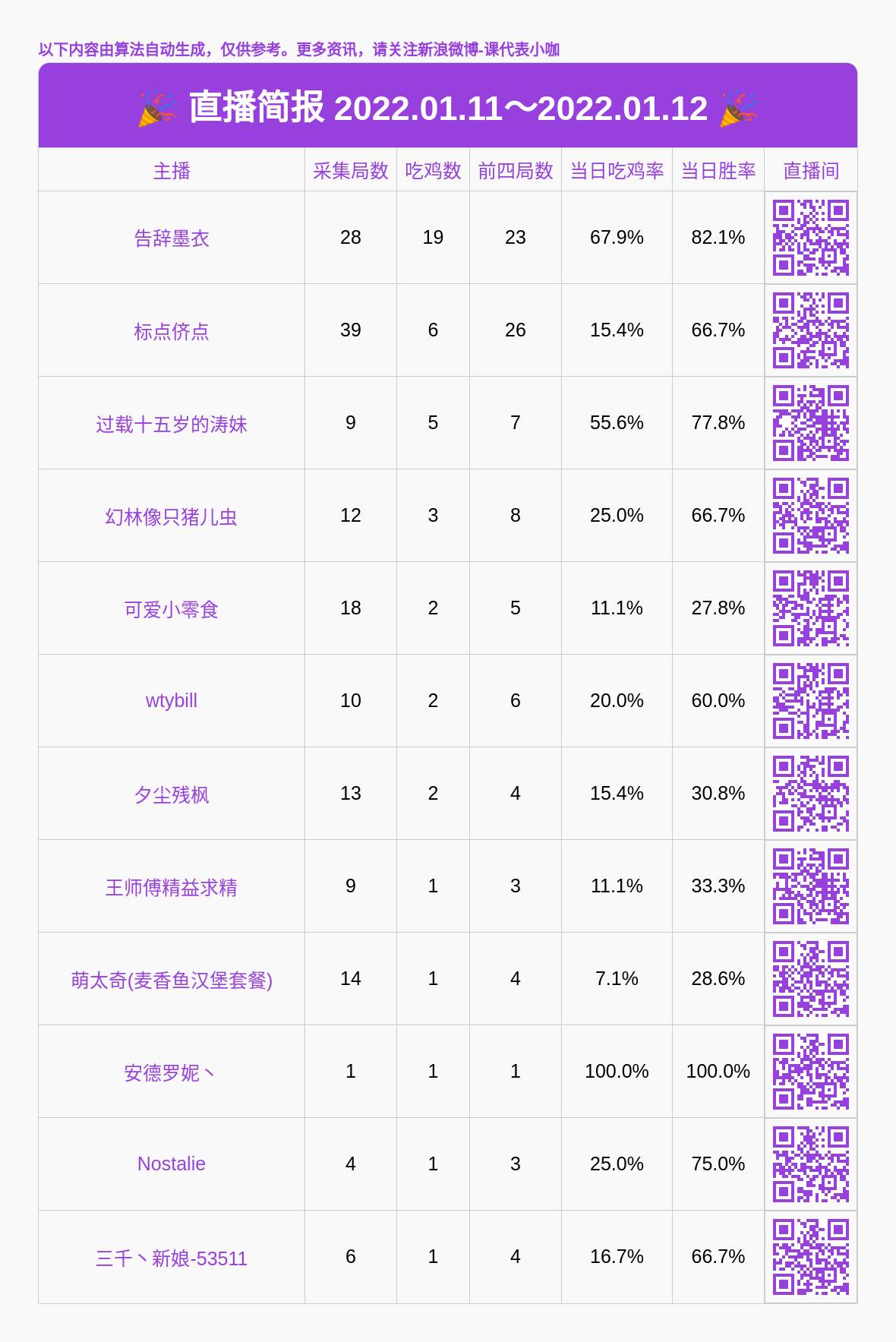 吃鸡时刻(采集自2022-01-11 06:00:00至2022-01-12 06:00:00):